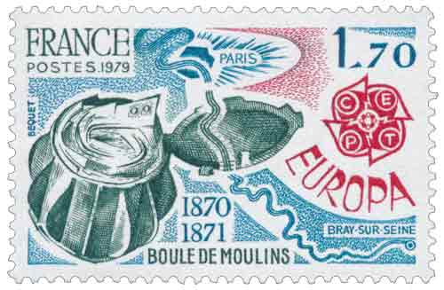 | Description | Europa. Boule de Moulins. Procédé de transport du courrier employé lors du siège de la ville de Paris en 1870. Le courrier était centralisé à Moulins, dans l'Allier, d’où son nom, et ensuite largué dans la Seine à Bray-sur-Seine |