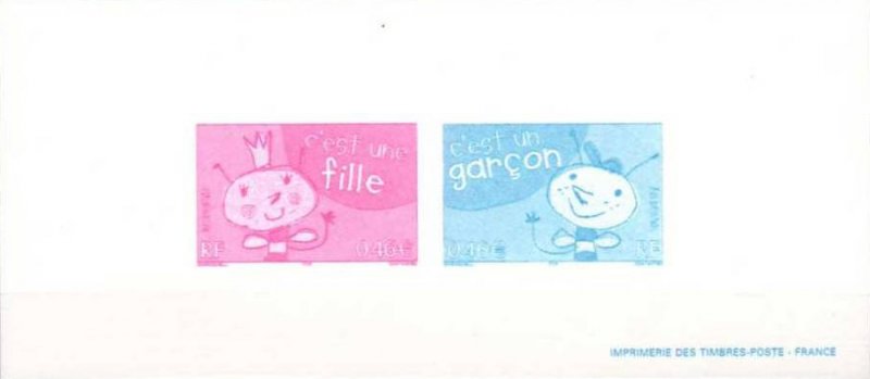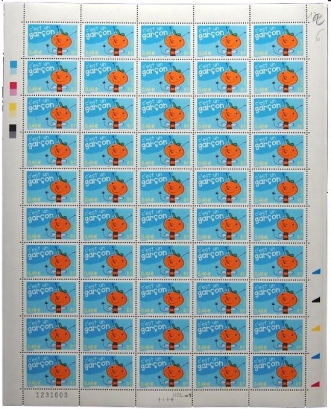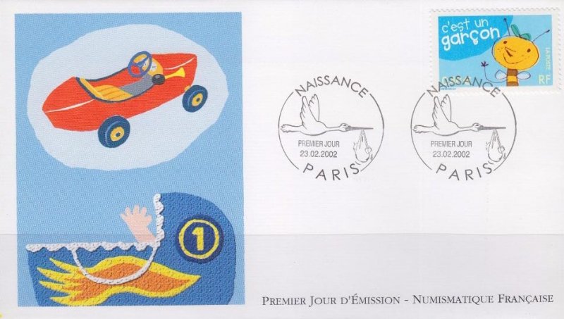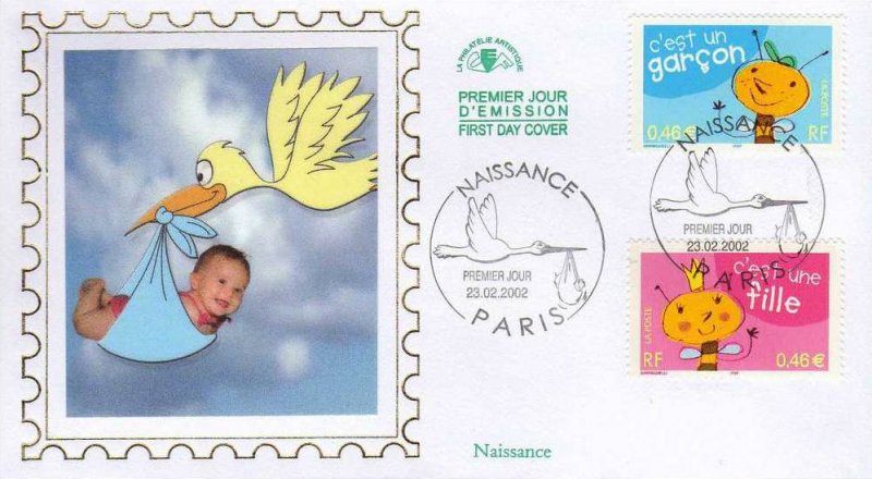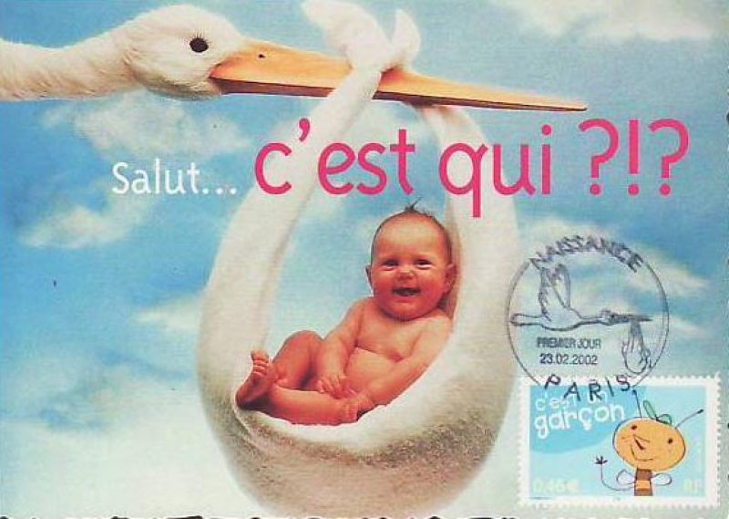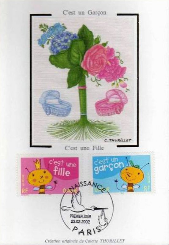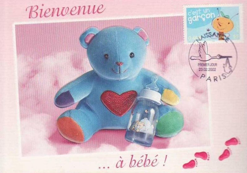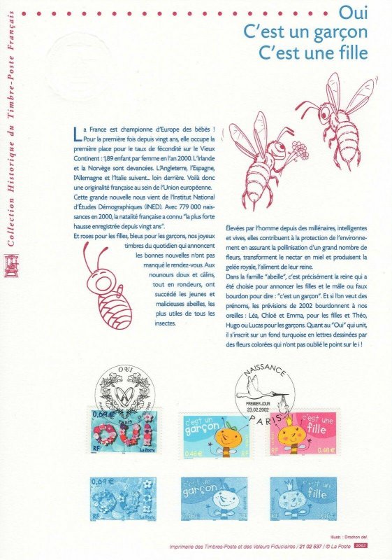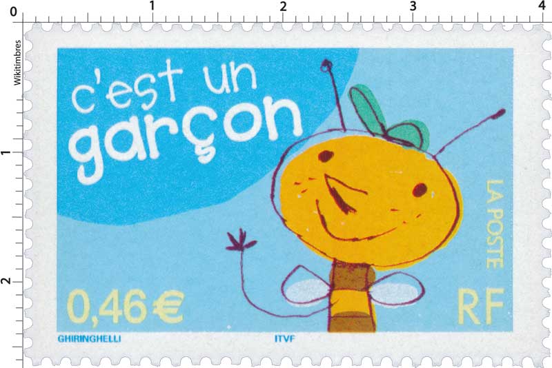| Commentaire | Description synthétique du visuel du timbre : Un visuel ludique, jeune, aux couleurs présentes sans être trop vives illustre ce timbre naissance de l’année 2002 : une abeille malicieuse, coiffée d’une casquette, clin d’œil au style vestimentaire des petits garçons, repose sur un fond sobre en camaïeu de bleu Un visuel quasi similaire, décliné en rose, illustre le timbre c’est un fille. Timbre sans millésime |