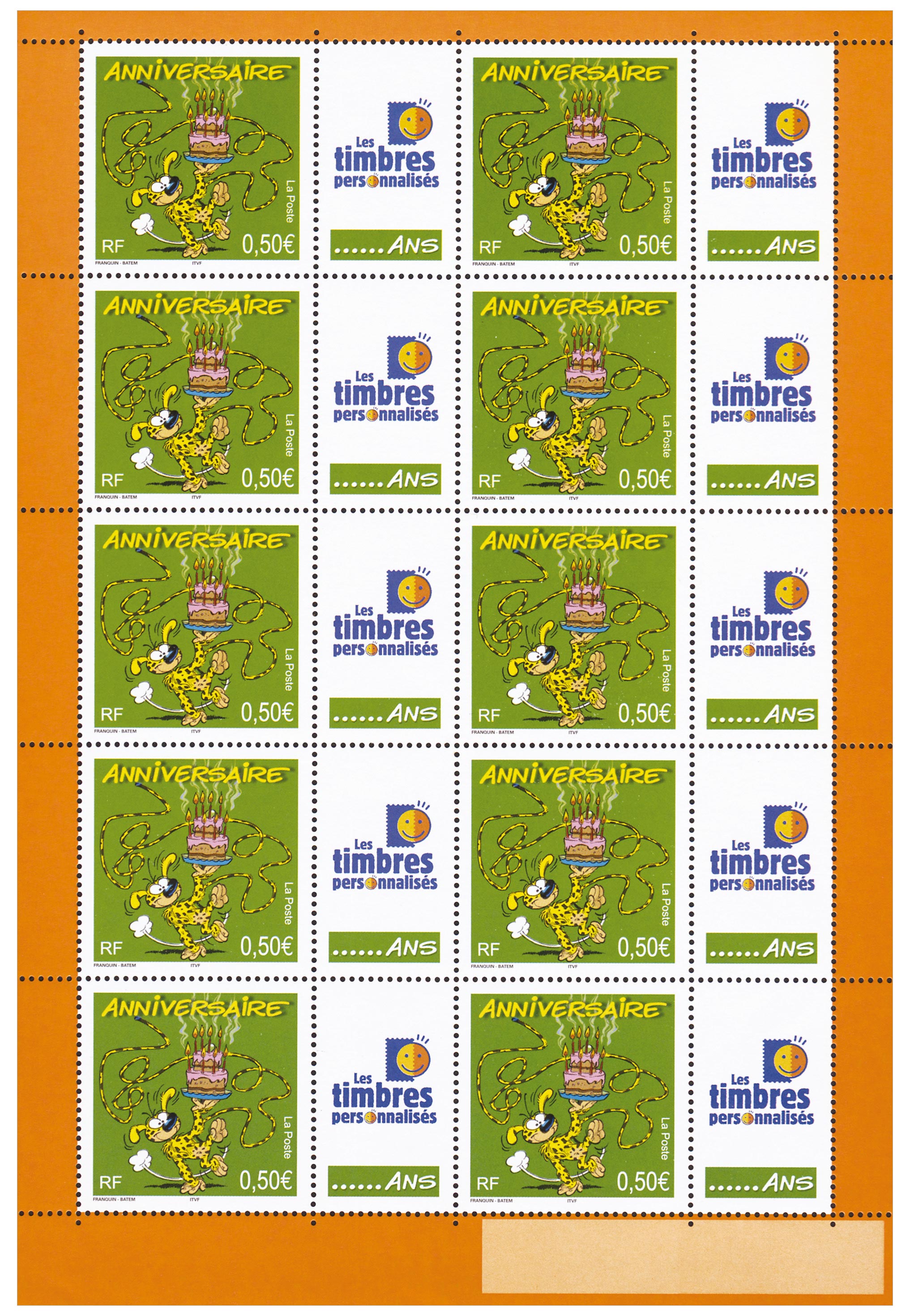 | Description | Timbre pour anniversaires. Personnage de bande dessinée. Marsupilami, d'André Franquin et Batem. |