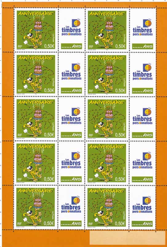 | Description | Timbre pour anniversaires. Personnage de bande dessinée. Marsupilami, d'André Franquin et Batem. |