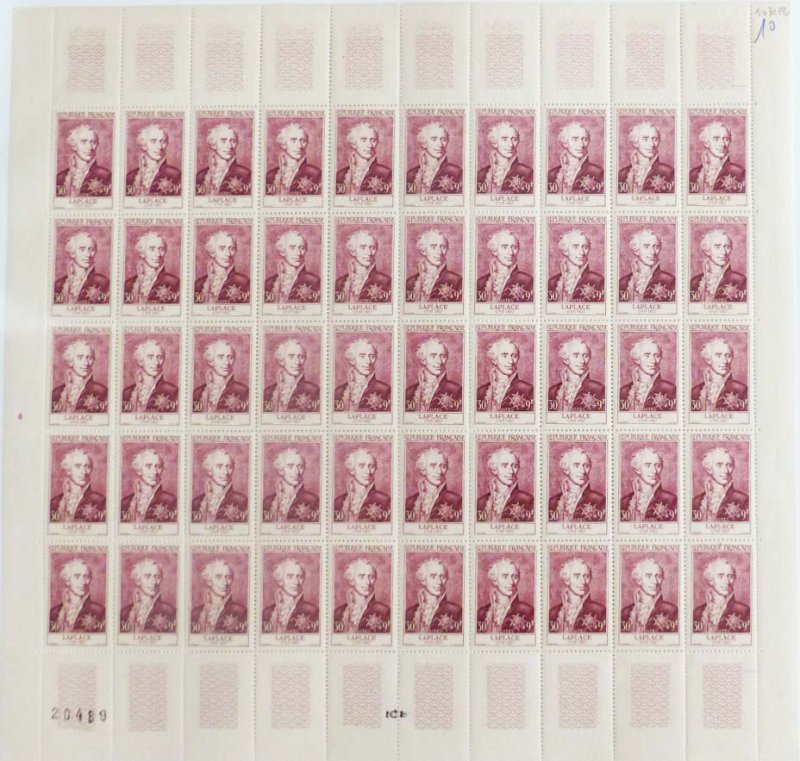 | Commentaire | Ce timbre est grevé d'une surtaxe au profit de la Croix Rouge française Émis en 1955 dans une série de six timbres-poste français consacrée à des personnages célèbres et assortie d’une surtaxe au profit de la Croix-Rouge française, le timbre dédié à Pierre-Simon de Laplace rend hommage à l’un des plus grands savants français des XVIIIᵉ et XIXᵉ siècles, figure majeure de l’astronomie mathématique et de la théorie des probabilités. Gravée en taille-douce et imprimée en format vertical, la figurine s’inscrit dans une émission cohérente par sa technique et par son ambition culturelle, rappelant l’œuvre scientifique considérable de Laplace, depuis l’Exposition du système du monde jusqu’à la Mécanique céleste, qui a profondément renouvelé la compréhension des mouvements astronomiques en prolongeant et en systématisant l’héritage newtonien. Le choix de Laplace illustre la volonté de l’administration postale de valoriser la science française comme élément du patrimoine national, tandis que l’usage postal du timbre correspond à l’affranchissement de la lettre simple pour l’étranger, la surtaxe associée inscrivant cette émission dans la tradition des timbres de solidarité au bénéfice de la Croix-Rouge française. |