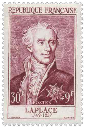 | Commentaire | Ce timbre est grevé d'une surtaxe au profit de la Croix Rouge française Émis en 1955 dans une série de six timbres-poste français consacrée à des personnages célèbres et assortie d’une surtaxe au profit de la Croix-Rouge française, le timbre dédié à Pierre-Simon de Laplace rend hommage à l’un des plus grands savants français des XVIIIᵉ et XIXᵉ siècles, figure majeure de l’astronomie mathématique et de la théorie des probabilités. Gravée en taille-douce et imprimée en format vertical, la figurine s’inscrit dans une émission cohérente par sa technique et par son ambition culturelle, rappelant l’œuvre scientifique considérable de Laplace, depuis l’Exposition du système du monde jusqu’à la Mécanique céleste, qui a profondément renouvelé la compréhension des mouvements astronomiques en prolongeant et en systématisant l’héritage newtonien. Le choix de Laplace illustre la volonté de l’administration postale de valoriser la science française comme élément du patrimoine national, tandis que l’usage postal du timbre correspond à l’affranchissement de la lettre simple pour l’étranger, la surtaxe associée inscrivant cette émission dans la tradition des timbres de solidarité au bénéfice de la Croix-Rouge française. |