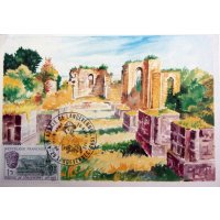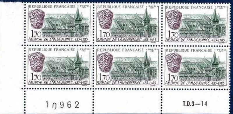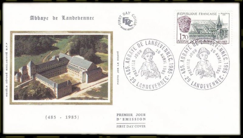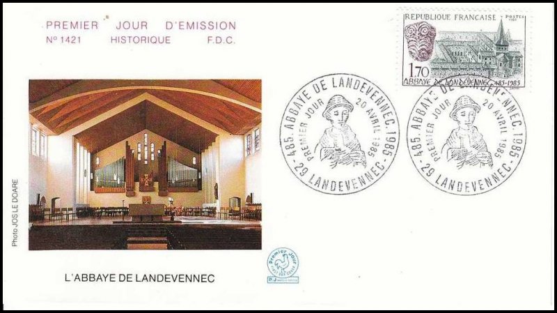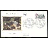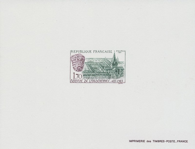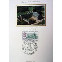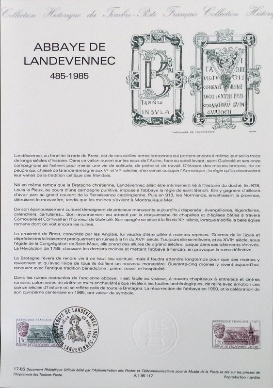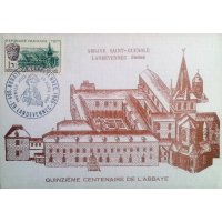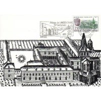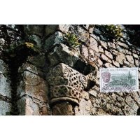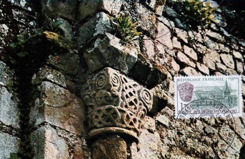 | Commentaire | Visuel : l’abbaye au XVIIe siècle, planche gravée du Monasticon Gallicanum (collection de 168 planches topographiques gravées des 147 monastères de l'ordre de Saint-Benoît) + Musée de l’abbaye : un fragment de l'église abbatiale romane du Xe siècle, avec l'un des chapiteaux à entrelacs, en granite. |