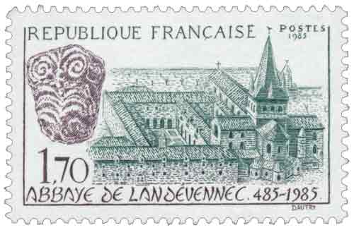 | Commentaire | Visuel : l’abbaye au XVIIe siècle, planche gravée du Monasticon Gallicanum (collection de 168 planches topographiques gravées des 147 monastères de l'ordre de Saint-Benoît) + Musée de l’abbaye : un fragment de l'église abbatiale romane du Xe siècle, avec l'un des chapiteaux à entrelacs, en granite. Au fond de la rade de Brest, sur les rives de l’Aulne, Abbaye de Landévennec occupe une place singulière dans l’histoire religieuse et culturelle de la Bretagne. Ce timbre accompagne la célébration du quinzième centenaire de la fondation du monastère, traditionnellement datée de 485, lorsque saint Guénolé et ses compagnons s’installèrent dans ce vallon pour y mener une vie de prière, de travail et de solitude selon la tradition monastique celtique. Étroitement liée à la formation de la Bretagne chrétienne, l’abbaye connaît une histoire marquée par de profondes ruptures : adoption de la règle bénédictine sous Louis le Pieux au début du IXe siècle, destruction par les Normands au début du Xe siècle, renaissance médiévale culminant à la fin du XIe siècle avec l’édification d’une grande église romane, puis déclin progressif sous l’effet des guerres et des pillages. La Révolution française entraîne la dispersion définitive des moines et la ruine du site, réduit à l’état de vestiges. La résurrection spirituelle et patrimoniale engagée au XXe siècle, avec le retour d’une communauté bénédictine et la restauration des ruines, confère à l’émission de ce timbre une forte portée symbolique : elle associe mémoire historique, continuité religieuse et mise en valeur du patrimoine monumental breton. À travers cette commémoration, la politique postale française rappelle l’importance des grands foyers monastiques dans la structuration culturelle du territoire et inscrit Landévennec parmi les hauts lieux spirituels majeurs de France, tout en soulignant le rôle de la philatélie dans la transmission de l’histoire régionale et nationale. Article rédigé pour WikiTimbres |