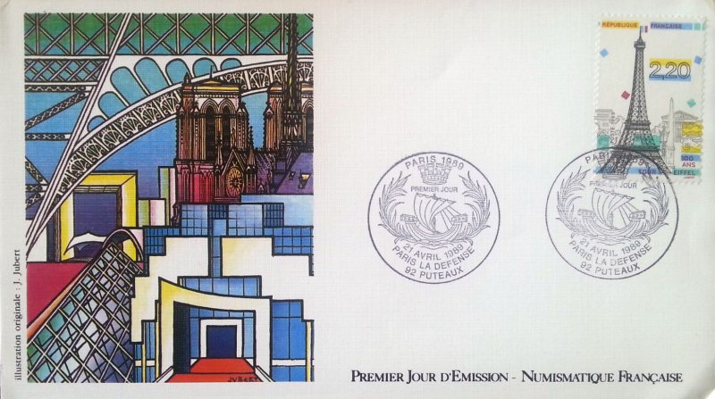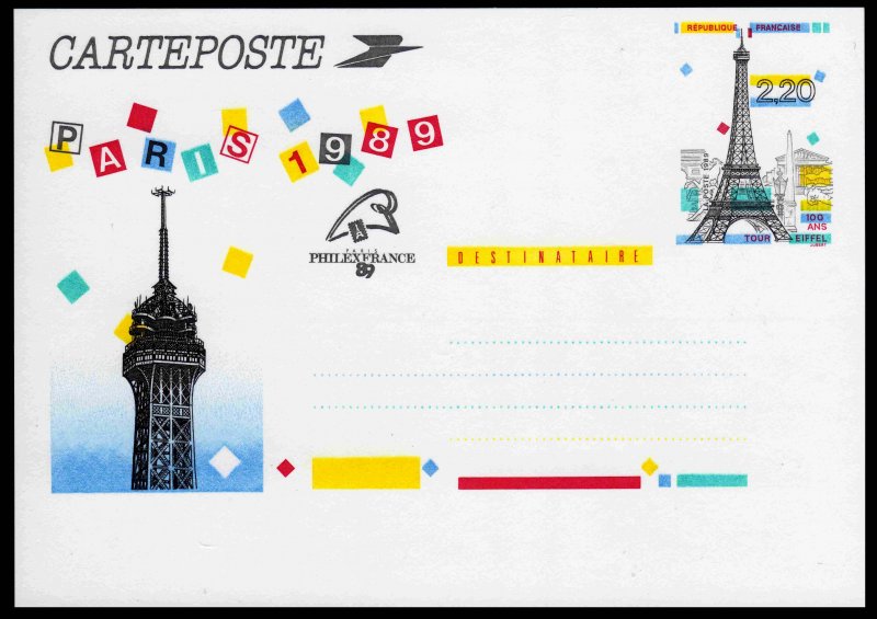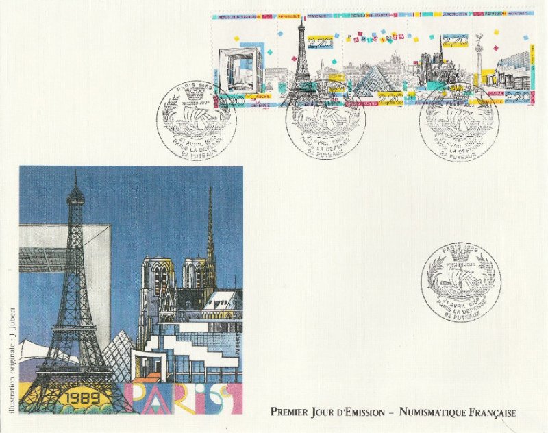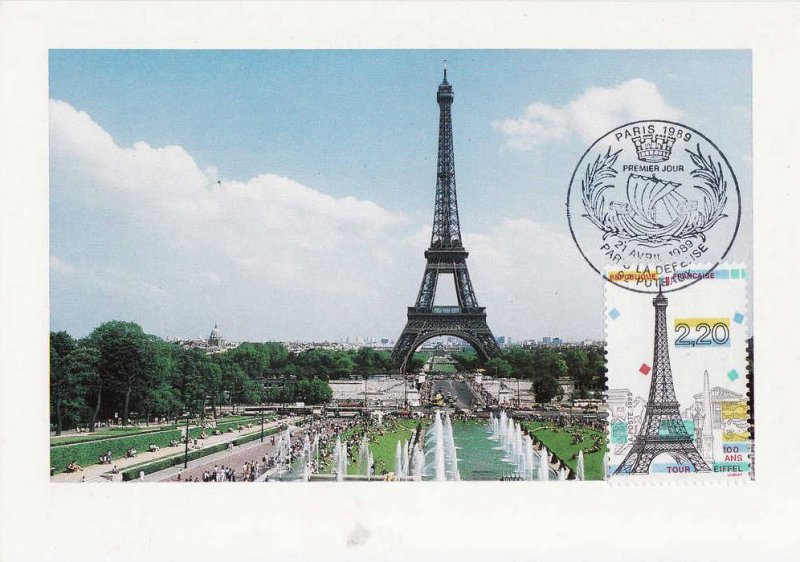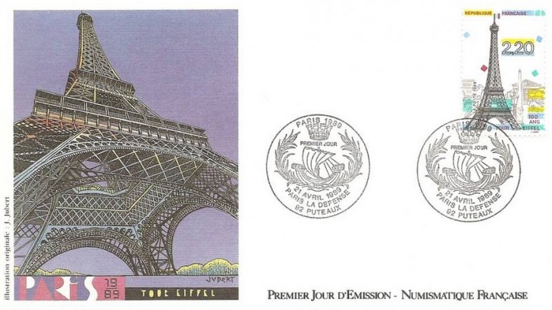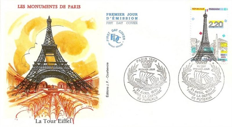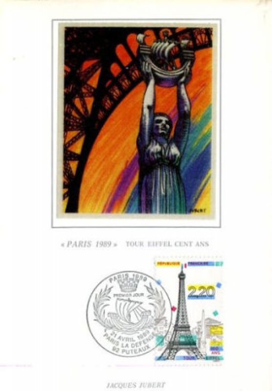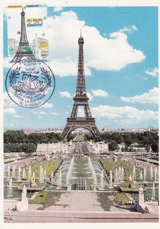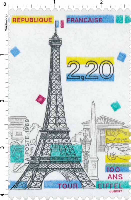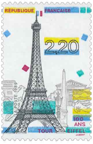 | Commentaire | Visuel : centenaire de la Tour Eiffel, avec en arrière plan l'arc de Triomphe, la Madeleine, l'Obélisque de la Concorde, un des "Chevaux de Marly" (Musée du Louvre), sculpture "l'Air" d'Aristide Maillol (1938, Jardin des Tuileries). |
