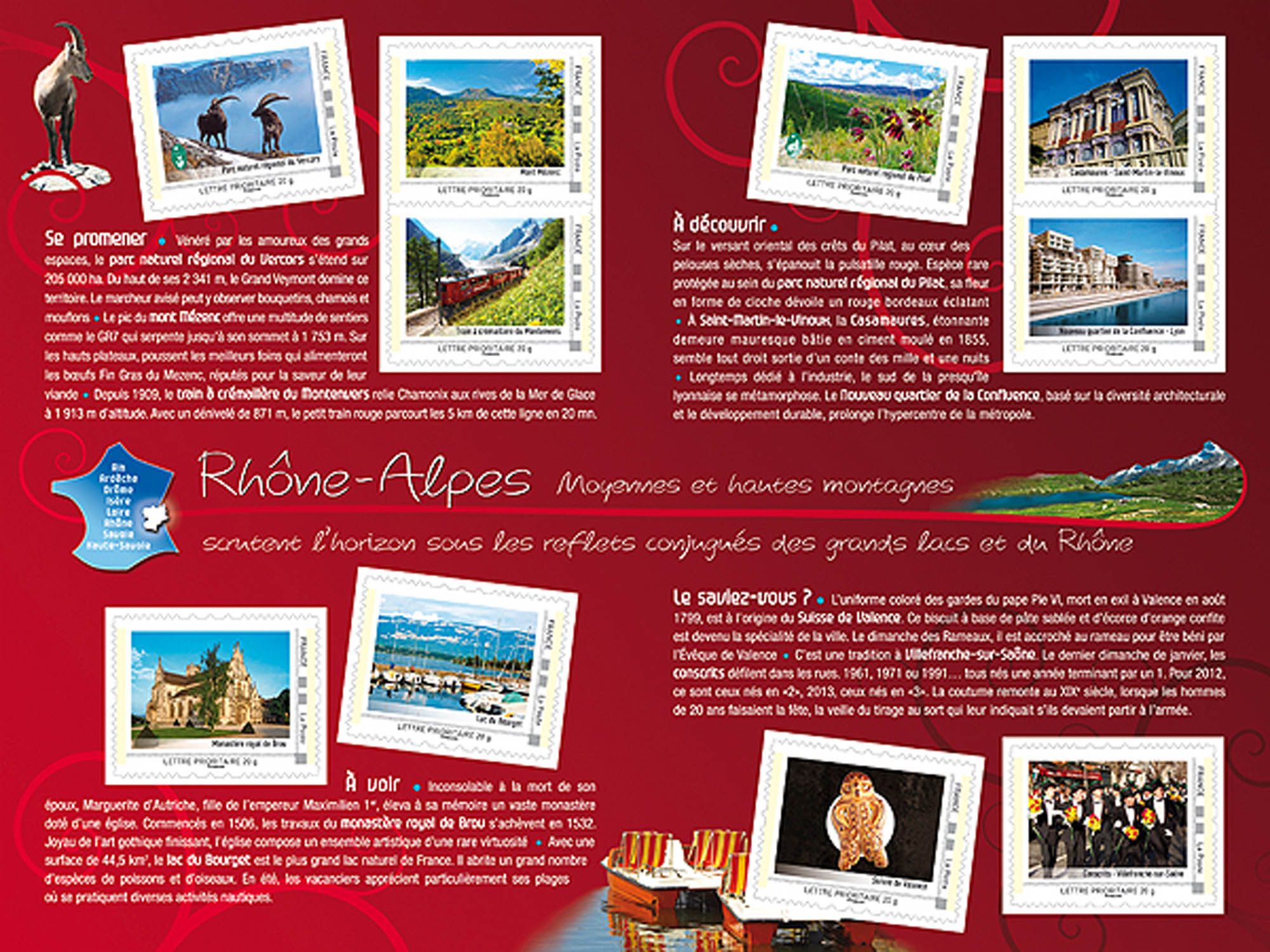 | Commentaire | Parc naturel régional du Vercors, Mont Mezenc, Train à crémaillère du Montenvers, Monastère royal de Brou, Lac du Bourget, Parc naturel régional du Pilat, Casamaures- Saint-Martin-le Vinoux, Nouveau quartier de la Confluence- Lyon, Suisse de Valence, Conscrits - Villefranche-sur-Saône |