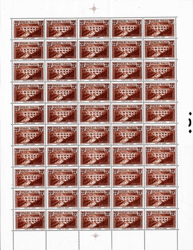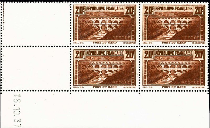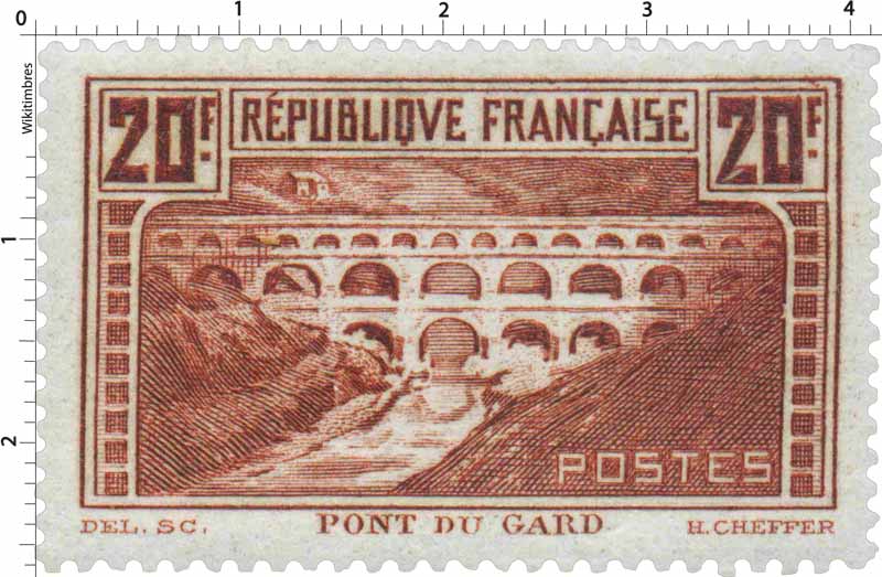 | Commentaire | Pont du Gard. Type I. Timbre erroné, il manque la moitié des arches supérieurs Voir la vidéo "Histoires de timbres" Le 20 francs Pont du Gard, émis le 15 mai 1929, compte parmi les plus majestueuses valeurs faciales de la fin des années 1920. Gravé et dessiné par Henry Cheffer, ce timbre en taille-douce, tiré sur feuilles de 25 exemplaires, s’inscrit dans la grande tradition des paysages monumentaux gravés de la IIIᵉ République. Sa longue période de circulation — avec retraits successifs jusqu’en novembre 1931 puis mai 1938 — reflète son usage sur les affranchissements lourds et internationaux, à une époque où les tarifs élevés nécessitaient des valeurs de forte amplitude. Cheffer livre ici l’une de ses gravures les plus équilibrées : le Pont du Gard, chef-d’œuvre de l’ingénierie romaine, est représenté selon une perspective latérale qui met en valeur ses trois niveaux d’arches et la verticalité du monument. Le brun, teinte choisie pour évoquer la pierre dorée du Gard, confère une profondeur et une densité visuelle caractéristiques des grandes émissions gravées de cette période. Sur le plan philatélique, ce timbre est emblématique du passage à une iconographie patrimoniale ambitieuse, destinée à promouvoir les grands sites architecturaux français. Son format horizontal de 40 × 26 mm et sa finesse de trait en font l’un des paysages gravés les plus recherchés de l’entre-deux-guerres, tant en neuf qu’en oblitéré de qualité. Émis en quantités non documentées avec précision mais notoirement inférieures à celles des valeurs de circulation courante, le Yvert 262 reste aujourd’hui une pièce emblématique pour les collectionneurs de paysages gravés et une référence incontournable pour toute étude thématique consacrée aux monuments classés. |
