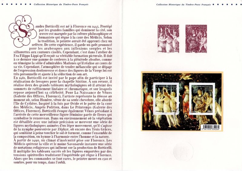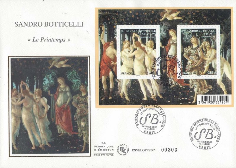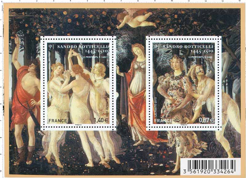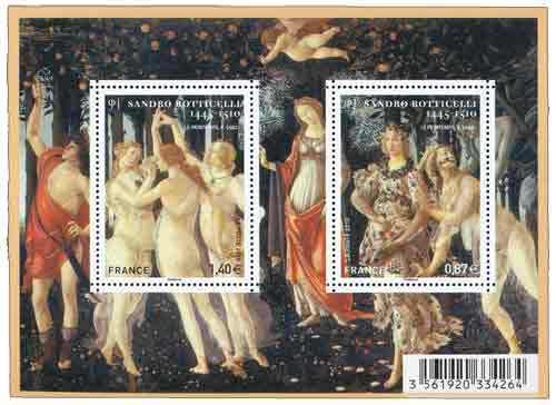 | Commentaire | Après avoir débuté sous la direction de son maître Filipo Lippi, Sandro Botticelli est entré dans la vie artistique florentine après les frères Pollaiuolo et Verrocchio, et a précédé Léonard de Vinci. Bien qu’ayant réalisé des œuvres chrétiennes, il est surtout connu pour ses œuvres profanes imprégnées d’humanisme et d’une grâce souvent mélancolique. Parmi ses œuvres, que l’on attribue à sa période dite des icônes de la Renaissance, figure Le Printemps, réalisée vers 1482. Botticelli a placé dans une nature irréelle cette allégorie du printemps dont les figures sont empruntées à la mythologie classique : Vénus au centre, Zéphire le vent, Chloris la nymphe et Flore à droite, Mercure à gauche, les trois Grâces… Une œuvre dont la symbolique est plus complexe qu’il n’y parait Timbre à date conçu par Aurélie Baras