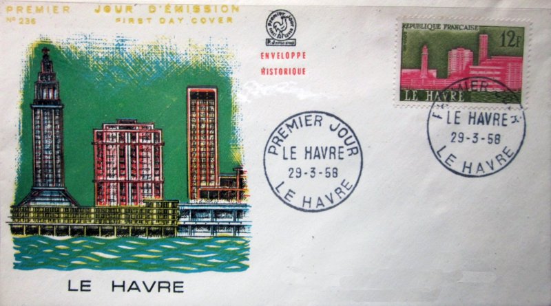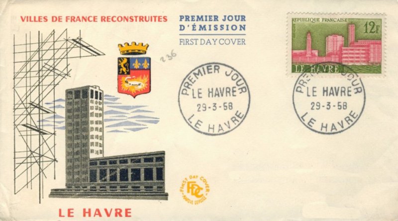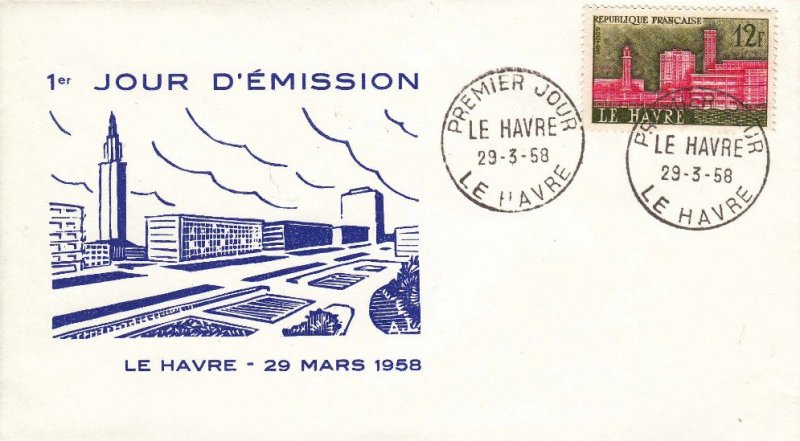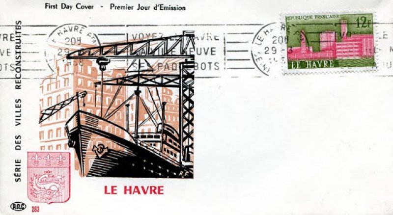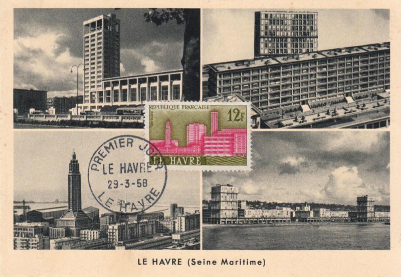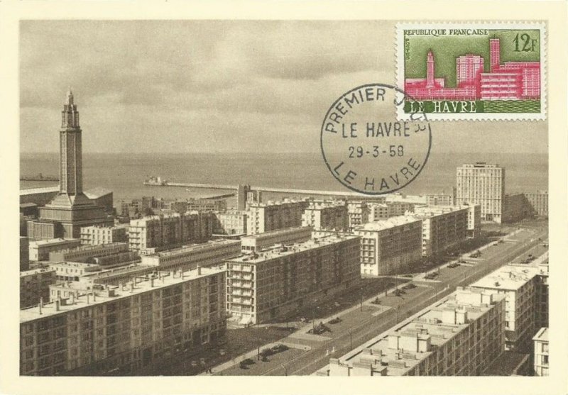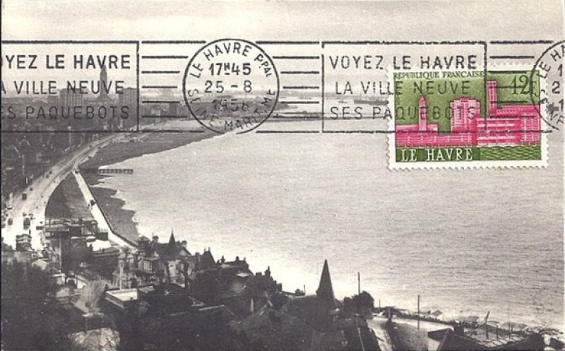 | Commentaire | Plan d'urbanisme : en portant son principal effort sur les quartiers totalement détruits, l'architecte n'en a pas négligé pour autant, l'aménagement de la ville et de l'agglomération. Des ensembles d'allure monumentale - place de l'Hôtel-de-Ville, porte océane, front de mer Sud - encadrent des groupes de constructions d'une grande unité ; l'église Saint-Joseph, avec sa flèche de 107 m, domine la cité nouvelle. Le Havre peut ainsi jouer dignement et pleinement son rôle d'escale pour les lignes étrangères et surtout de point de départ des grandes lignes maritimes françaises. |
