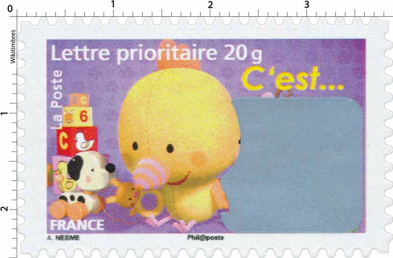 | Commentaire | La mise en vente premier jour a lieu le 28 mai au Jardin d'acclimatation, à Paris. Le bébé garçon d'Alexis Nesme est repris sur le cachet premier jour. Un nouveau concept de timbre est proposé cette année pour les carnets Naissance : le timbre à gratter. |