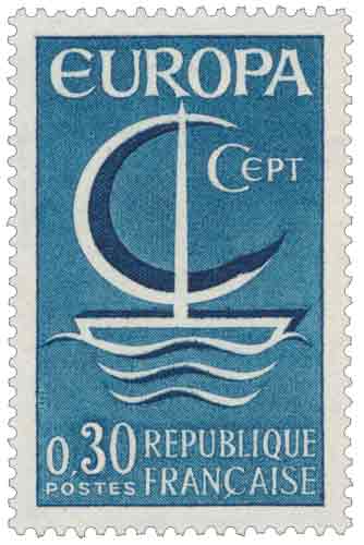| Commentaire | Émis en France en 1966 dans le cadre de la onzième émission commune EUROPA, le timbre bleu de 0,30 franc illustre la volonté de coopération postale et télécoms des pays européens à travers un dessin volontairement épuré représentant un voilier avançant sur une mer stylisée, symbole du mouvement et du progrès partagé, dont la voile porte l’emblème de la C.E.P.T., organisation créée à la fin des années 1950 pour harmoniser et moderniser les échanges postaux et les télécommunications en Europe occidentale ; choisi par l’ensemble des administrations participantes, le motif conçu par Gregor et Josef Bender traduit graphiquement l’idée d’un avenir commun fondé sur la coordination technique et tarifaire, dans un contexte où la construction européenne s’exprime aussi par des initiatives culturelles et philatéliques destinées à renforcer un sentiment d’appartenance collective ; ce timbre s’inscrit ainsi dans la politique commémorative française des années 1960, utilisant la série EUROPA comme vecteur de visibilité internationale et comme reflet discret mais constant de l’engagement de la France dans la coopération européenne. Article rédigé pour WikiTimbres |