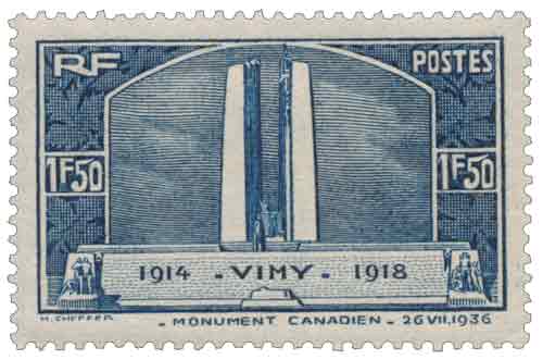 | Commentaire | Vimy (1914-1918) - Monument Canadien - 26 VII 1936. Visuel : Inauguration du monument de Vimy à la mémoire des canadiens tombés au cours de la Grande Guerre de 1914-1918 - La bataille est commémorée par le mémorial de Vimy, situé au sommet de la cote 145 entre Vimy et Givenchy-en-Gohelle (62-Pas-de-Calais). Émis le 26 juillet 1936, simultanément à l’inauguration solennelle du Mémorial canadien de Vimy par le roi Édouard VIII, ce timbre de 1 franc 50, réalisé en taille-douce bleue par Henry Cheffer, constitue l’une des plus fortes évocations philatéliques de la mémoire canadienne en France. Par rapport au 75c émis le même jour, cette valeur plus élevée adopte une tonalité bleue, destinée à distinguer visuellement la seconde partie de l’hommage postal. Le tirage fut limité à 5 millions d’exemplaires, ce qui explique sa cote nettement supérieure en neuf et en oblitéré. Cheffer choisit une composition particulièrement épurée qui met en valeur les deux pylônes monumentaux du mémorial, œuvre de l’architecte Walter S. Allward, dont la silhouette domine l’ancienne ligne de front. La gravure, très contrastée malgré une encre unique, parvient à restituer la monumentalité du site et la solennité voulue par le Canada pour honorer ses 66 000 morts de la Grande Guerre et les 11 285 disparus dont les noms sont gravés dans la pierre. Cette représentation philatélique n’illustre pas seulement le lieu : elle participe à sa symbolique, rappelant la reconnaissance française pour le sacrifice canadien et l’importance diplomatique de l’événement en 1936. L’émission est également remarquable sur le plan postal : l’oblitération Premier Jour eut lieu directement sur la crête de Vimy, élément rare à l’époque et recherché par les spécialistes. Aucune variété importante n’est répertoriée, mais des nuances de bleu existent selon les tirages. Ce timbre est aujourd’hui un incontournable des collections thématiques consacrées à la Première Guerre mondiale, aux mémoriaux, ou à l’œuvre gravée d’Henry Cheffer. |