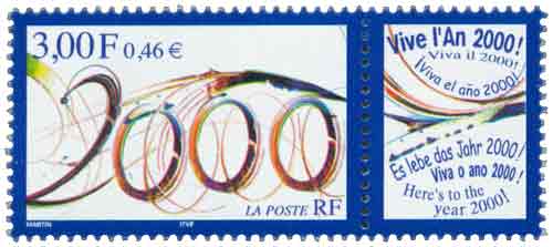 | Commentaire | Avec une vignette attenante 16 mm x 22 mm. Description synthétique du visuel du timbre : Par le biais d’une calligraphie contemporaine, raffinée et discrète à la fois, composée de lignes courbes et colorées, le visuel marque l’avènement de l’année mythique 2000. Pour marquer l’événement, ce timbre de format classique est accompagné d’une vignette accolée à sa droite, sur laquelle le texte Vive l’An 2000 ! Figurent en six langues : français, italien, espagnol, allemand, portugais et anglais. La calligraphie dépasse le cadre du timbre et se projette dans la vignette, symbolisant ainsi l’élan vers l’an 2000. La présence de dentelures bleues constitue un écrin à la calligraphie. La couleur bleue des dentelures, le chiffre 2000 et les textes de la vignette font de ce timbre un timbre générique, utilisable durant toute l’année 2000. |