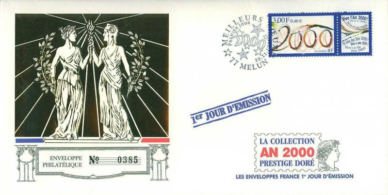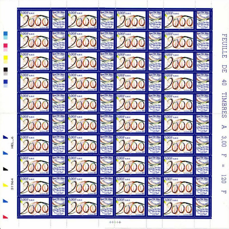 | Commentaire | Avec une vignette attenante 16 mm x 22 mm. Description synthétique du visuel du timbre : Par le biais d’une calligraphie contemporaine, raffinée et discrète à la fois, composée de lignes courbes et colorées, le visuel marque l’avènement de l’année mythique 2000. Pour marquer l’événement, ce timbre de format classique est accompagné d’une vignette accolée à sa droite, sur laquelle le texte Vive l’An 2000 ! Figurent en six langues : français, italien, espagnol, allemand, portugais et anglais. La calligraphie dépasse le cadre du timbre et se projette dans la vignette, symbolisant ainsi l’élan vers l’an 2000. La présence de dentelures bleues constitue un écrin à la calligraphie. La couleur bleue des dentelures, le chiffre 2000 et les textes de la vignette font de ce timbre un timbre générique, utilisable durant toute l’année 2000. |