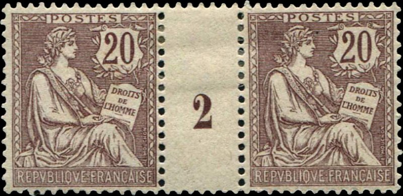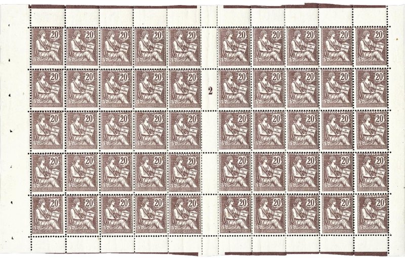 Pour remédier à ces défauts, Louis-Eugène Mouchon reprend son propre dessin et réalise une retouche profonde du poinçon : Le 20 c retouché remplace ainsi le 20 c Mouchon type I (YT 113), dont la nuance brun lilas est conservée mais avec une structure graphique considérablement plus stable. Cette valeur correspond à un affranchissement intérieur courant, notamment pour les imprimés et certaines lettres à tarif réduit, ce qui explique son usage significatif entre 1902 et 1903. Imprimé en typographie sur feuilles de 150 timbres, dentelés 14 × 13½, il n’existe qu’en une seule grande période de production, sans changement de nuance majeur. Sa durée de vente, de mai 1902 à juin 1903, reste brève, car dès l’été 1903, les timbres au type Semeuse lignée prennent le relais pour les valeurs intermédiaires.