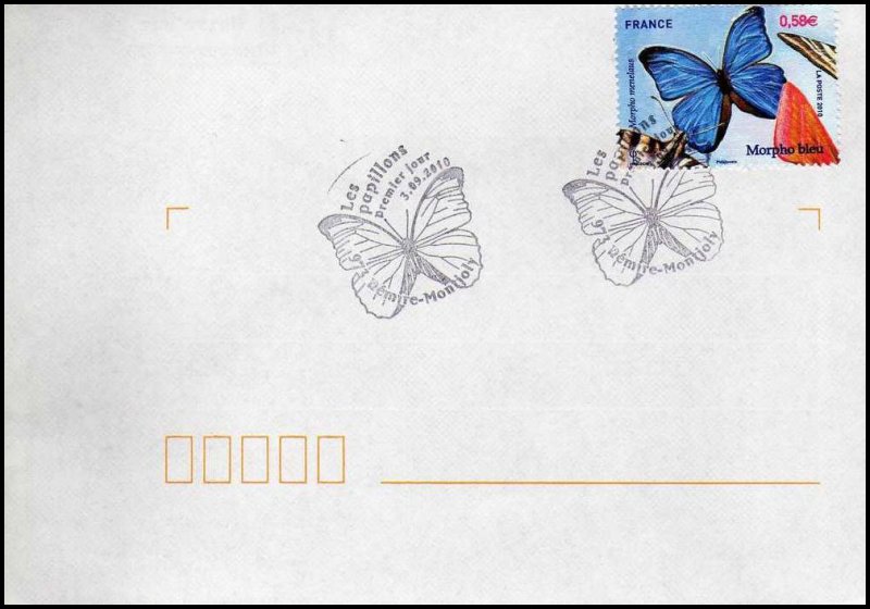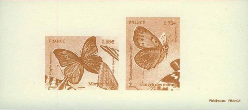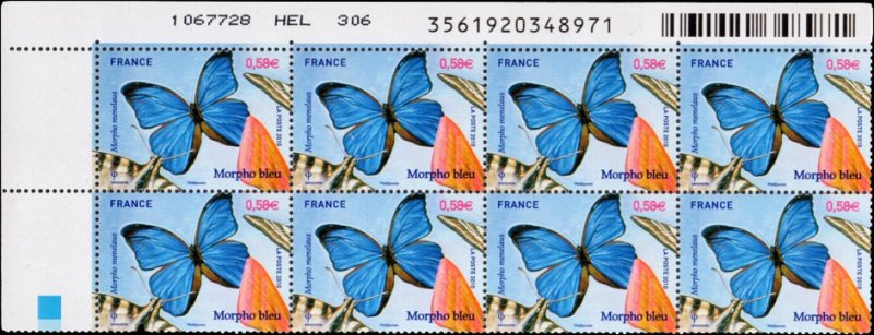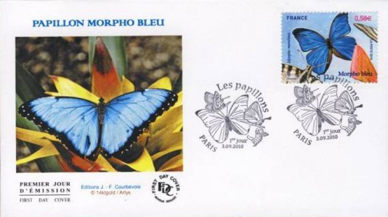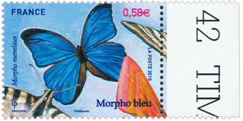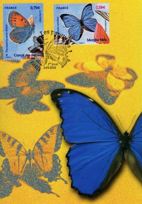 | Commentaire | Le papillon, considéré comme un symbole de grâce et de légèreté, représente également la résurrection, le soleil chez les Aztèques, la femme au Japon et l’âme mariée à l’amour dans la mythologie grecque. Le cuivré des marais, le morpho bleu et le thécla de la ronce illustrent chacun un des timbres du bloc Nature 2010, le 4e timbre étant dédié à la chenille du grande queue fourchue. Ces insectes lépidoptères sous leur forme adulte sont caractérisés par deux paires d’ailes recouvertes d’écailles fines. La couleur bleue ou verte des écailles des 3 papillons sera mise en lumière par la pose d’un film iridescent complétée d’un gaufrage. INFOS PRATIQUES PREMIER JOUR : 3 et 4 septembre 2010 Vente Anticipée : à Paris, Vannes (56), Haute-Goulaine (44), Hunawihr (68), Cintegabelle (31), Rémire-Montjoly (973 |