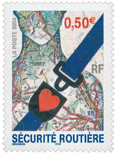 | Commentaire | C’est dans cadre d’une campagne mondiale organisée par L’O.N.U. que l’artiste Michel Granger a créé six visuels pour trois villes soit 2 pour la ville de New York, 2 pour Vienne et 2 Genève. Les visuels ont été conçus avec La Poste des Nations Unies. La Poste a retenu un visuel représentant une silhouette en fond de carte routière et le port de la ceinture de sécurité. |