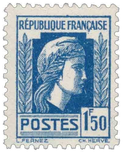 | Commentaire | Timbre gommé émis en France en 1944, la valeur de 1,50 franc bleu de la série Marianne d’Alger appartient aux premières émissions d’usage courant mises en circulation par le Comité français de Libération nationale à partir des territoires libérés, d’abord en Algérie française puis en métropole. Dessiné par Louis Fernez et reproduit par reports de Charles Hervé, ce timbre représente une Marianne sobre et dépouillée, associant le monogramme « RF » et la croix de Lorraine, symboles explicites du rétablissement de l’autorité républicaine en France à la fin de la Seconde Guerre mondiale. La valeur faciale de 1,50 F correspond au tarif de la lettre simple pour le régime intérieur à compter du 15 novembre 1944, ce qui explique une utilisation postale effective et régulière. Imprimée localement à Alger par l’entreprise Typo-Litho Carbonnel, sous contrôle de l’imprimerie Heintz, cette émission se distingue philatéliquement par ses coins datés correspondant aux dates de contrôle des feuilles et non aux dates d’impression, particularité propre à la série. Considérée comme la première Marianne officiellement adoptée sur un timbre-poste français, cette valeur de 1944 marque une étape symbolique dans l’histoire postale française en liant usage courant, contexte politique de la Libération et renaissance des emblèmes républicains. |