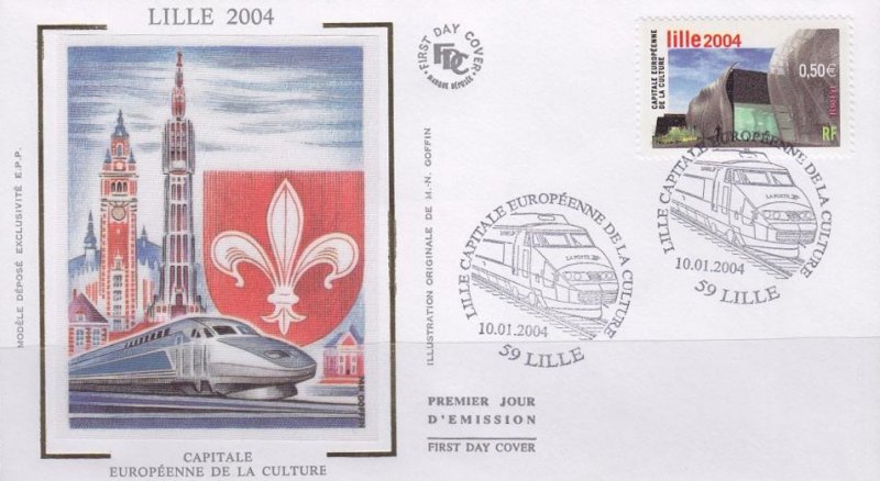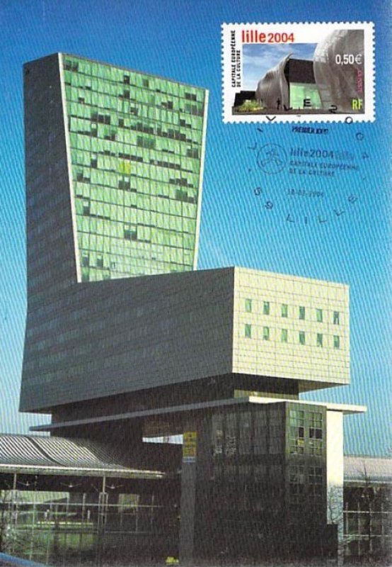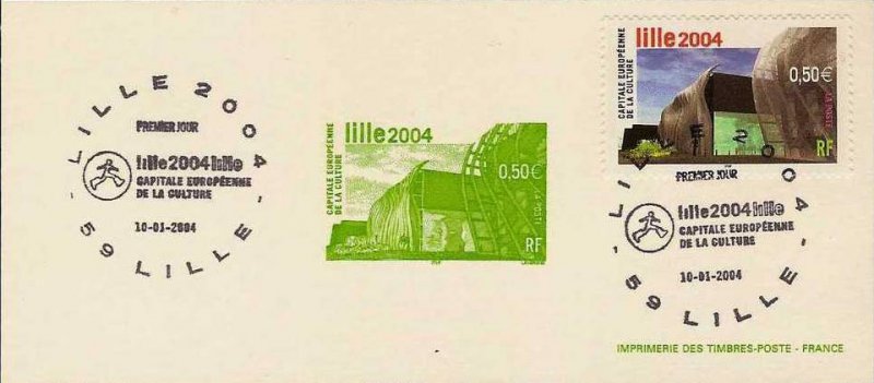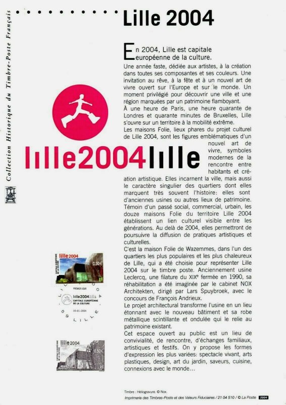 | Commentaire | Après des villes telles que Glasgow, Anvers, Copenhague et Stockholm …, les Ministres de la Culture de l’Union Européenne ont désigné Lille Capitale Européenne de la Culture en 2004. A cette occasion un timbre sera émis mettant en scène une des « maisons folies ». Lieux phares du projet culturel, les « maisons folies » sont de nouveaux espaces aménagés dans d’anciennes filatures, béguinages, ferry boats … transformés en lieu de convivialité, de rencontre. Visuel : à l'emplacement de l'ancienne usine Leclercq, filature du XlXe fermée en 1990. La réhabilitation a été imaginée par le cabinet NOX Architekten. Le projet architectural transforme l'usine en un lieu étonnant avec le nouveau bâtiment et sa robe métallique scintillante et ondulée qui le relie au patrimoine existant. Cet espace ouvert au public est un lieu de convivialité, de rencontre, d'échanges familiaux, artistiques et festifs. On y propose les formes d'expression les plus variées : spectacles vivants, arts plastiques, design, art du jardin, saveurs, cuisine, connexions avec le monde. |