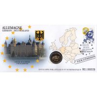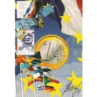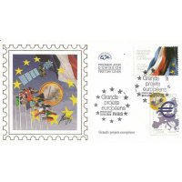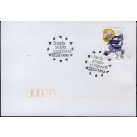 | Commentaire | BF 123. Le cachet premier jour de Stéphanie Ghinéa inscrit le titre du bloc dans les douze étoiles du drapeau européen. Il est disponible du 19 au 22 juin lors du Salon du timbre, à Paris C’est le président de la République en personne qui a choisi la nouvelle effigie de Marianne au terme d’un concours ayant pour thème Marianne et l’Europe. Il faut dire que cette nouvelle Marianne célèbre la prise par la France, non pas de la Bastille, mais de la présidence de l’Union européenne. Petite révolution, le président a souhaité associer la Marianne aux valeurs de l’Europe - paix, démocratie, environnement - au sein d’un carnet. Aux plumes, citoyens ! |