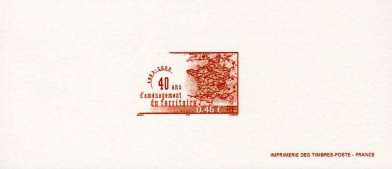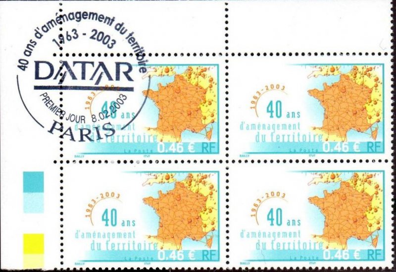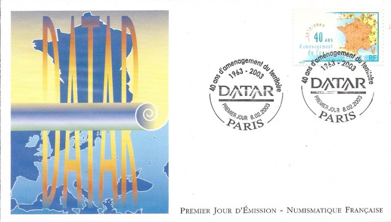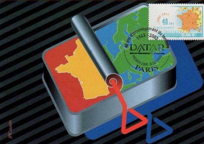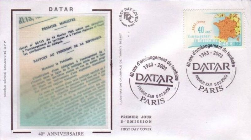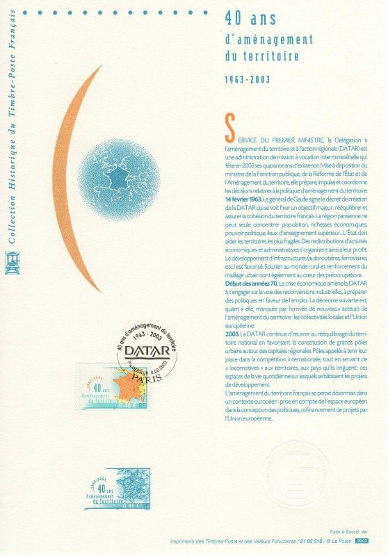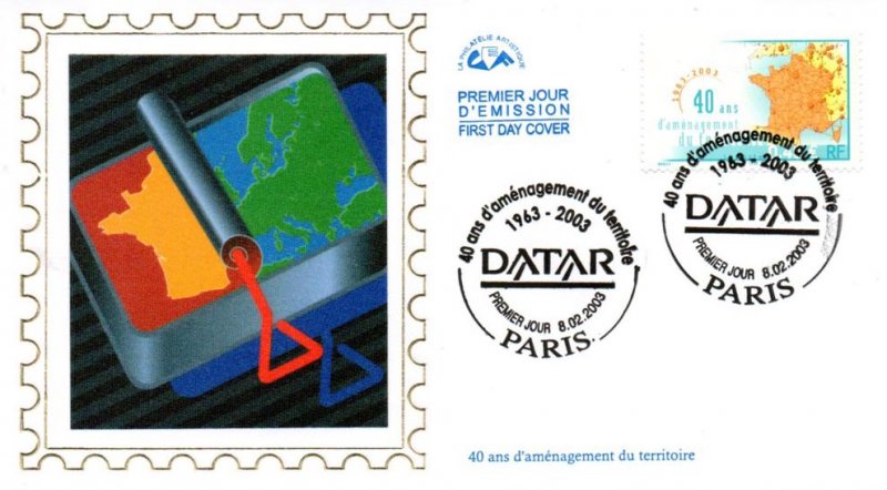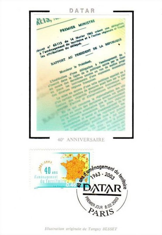 | Commentaire | Description synthétique du visuel du timbre : Créée par décret du 14 février 1963, la DATAR a pour mission de préparer et de coordonner les décisions relatives à l’aménagement du territoire conduite par l’État. Par sa force de proposition, d’arbitrage et de synthèse des politiques ministérielles sectorielles, elle optimise la cohérence des politiques de l’État à finalité territoriale tout en tendant vers un développement durable. Elle assure également l’interface entre les politiques européennes et nationales d’aménagement du territoire et les actions de développement conduites au niveau régional et local. En 2003, la DATAR continue d’œuvrer au rééquilibrage du territoire national en favorisant la constitution de grands pôles urbains autour des capitales régionales et prend en compte l’espace européen dans la conception des politiques. |