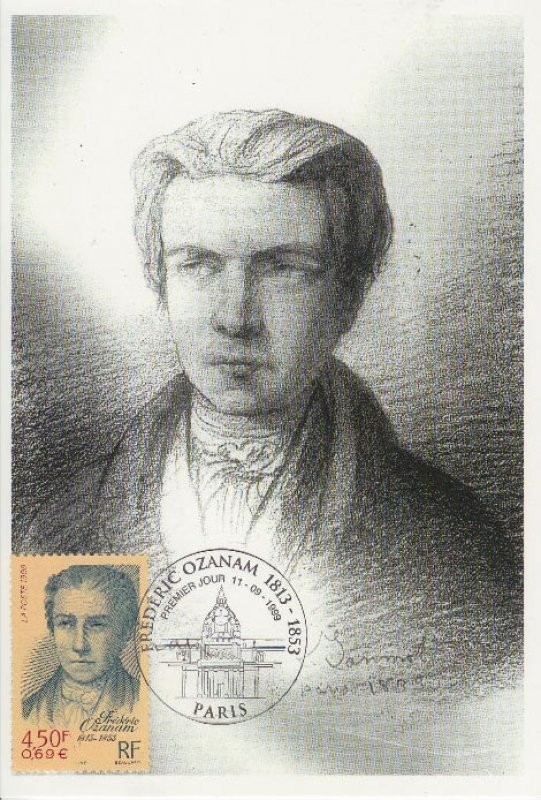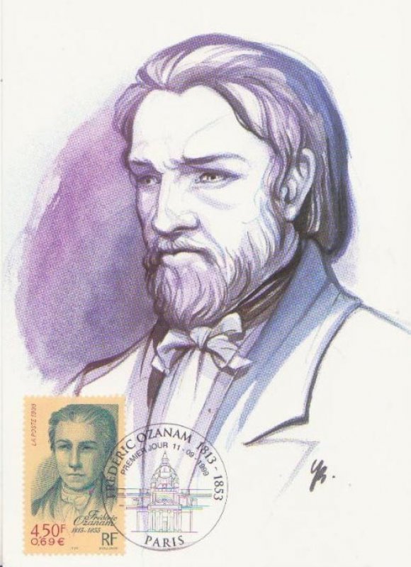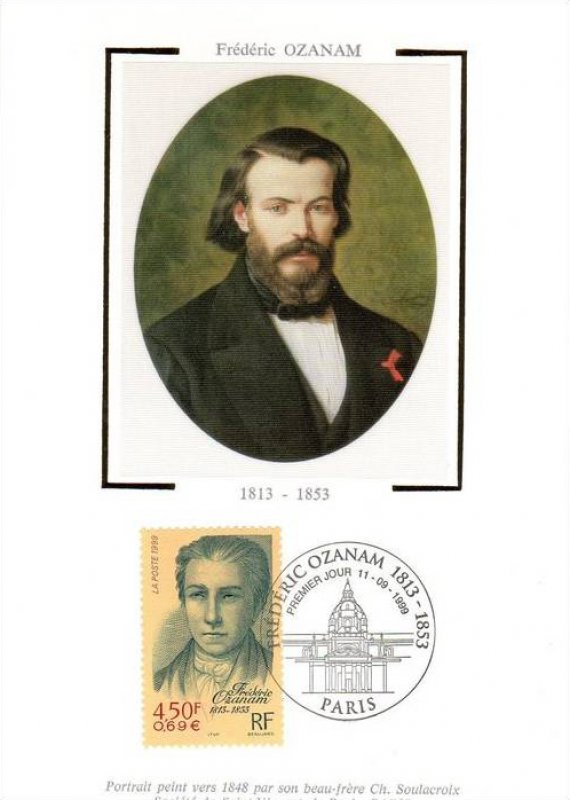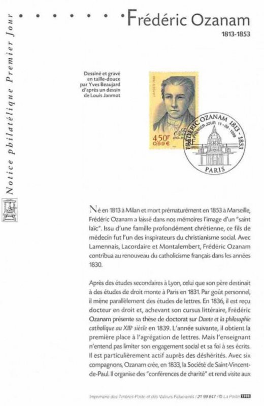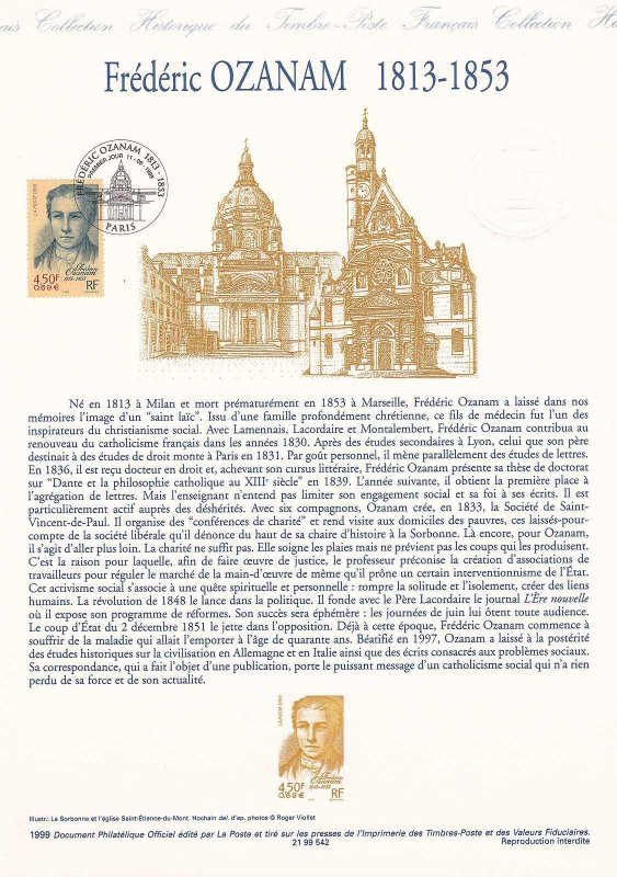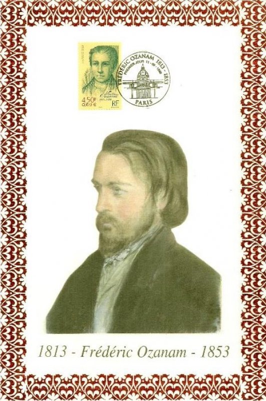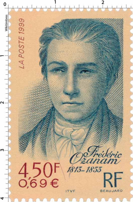 | Commentaire | Description synthétique du visuel du timbre : Frédéric Ozanam, écrivain français, fut un des inspirateurs du christianisme social et du libéralisme catholique. Il fut l’un des fondateurs de la conférence Saint-Vincent-de-Paul en 1833 puis devint professeur de littérature étrangère à la Sorbonne en 1841. Il est considéré aujourd’hui comme l’un des plus nobles apôtres laïcs du XIXe siècle |