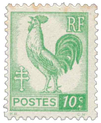 | Commentaire | Ce timbre gommé français de 1944, dit « Coq d’Alger », s’inscrit dans le contexte très particulier de la Libération progressive du territoire et de la pénurie de figurines postales, d’abord en Corse puis en métropole, ce qui conduit le Comité français de libération nationale à faire imprimer à Alger une nouvelle série symbolique destinée à rétablir la continuité du service postal ; la valeur de 10 centimes vert-jaune est conçue pour l’affranchissement des journaux, usage courant à faible valeur faciale, et se distingue par l’apparition officielle du coq gaulois sur un timbre-poste français, accompagné de la croix de Lorraine et du monogramme « RF », affirmant visuellement la rupture avec l’iconographie du régime précédent et la légitimité républicaine ; dessinée par Henry Razous et reproduite par reports lithographiques, cette émission est réalisée localement à Alger par l’imprimerie Typo-Litho Carbonnel, selon une technique de lithographie adaptée aux moyens disponibles et à une production rapide, avant une diffusion élargie à l’ensemble du territoire à partir de novembre 1944. |