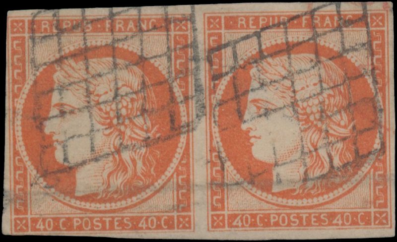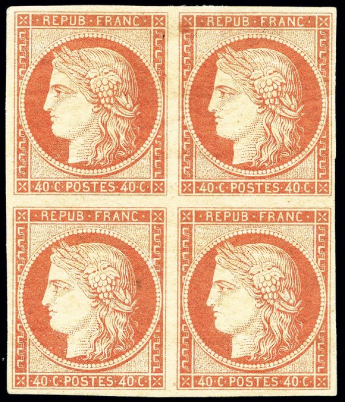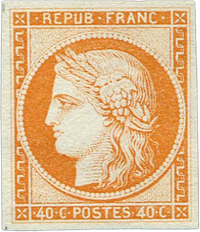 | Commentaire | Cérès - IIème République Voir la vidéo "Histoires de timbres" En savoir plus sur Wikipédia : Cérès Décidé en avril 1849 pour remplacer l’affranchissement réalisé jusque-là par deux timbres de 20 centimes, le 40 centimes orange au type Cérès constitue la troisième valeur d’usage courant mise en circulation sous la IIᵉ République. Son émission, initialement prévue en bleu, est retardée afin de réserver cette couleur au timbre de 20 centimes ; les feuilles de 40 c bleu imprimées au début de 1849 sont détruites. La teinte orange est définitivement adoptée, mais sa mise en vente n’intervient que le 3 février 1850, après le rappel des 1 franc rouge de nuance claire, jugés trop proches sous les éclairages de l’époque. Imprimé en typographie à plat dans les ateliers de la Monnaie de Paris, sous la direction d’Anatole Hulot, le timbre reprend l’effigie allégorique de Cérès conçue par Jacques-Jean Barre. Les feuilles comportent 300 timbres, divisés en deux panneaux de 150 exemplaires. Le tirage atteint environ 4,1 millions d’unités. Les nuances relevées s’échelonnent de l’orange clair à l’orange foncé, avec une constance de papier légèrement jaunâtre. Aucun tête-bêche n’existe dans les panneaux d’impression, mais une variété célèbre dite des « 4 retouchés » provient de l’insertion accidentelle de deux clichés de 20 centimes corrigés manuellement en « 40 ». Le 40 c orange est remplacé en septembre 1853 par un timbre de même valeur au type Prince-Président, mais ses planches seront réutilisées pour les tirages du Siège de Paris (1870), de la IIIᵉ République (1871–1874) et pour les colonies entre 1871 et 1875, rendant parfois délicate l’identification des premiers tirages.