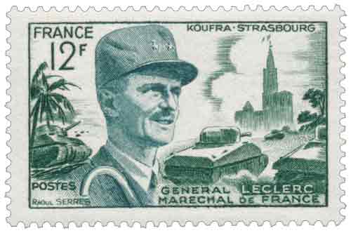 | Commentaire | Émis en France en 1954, le timbre-poste gommé de la série commémorative consacré au Philippe Leclerc de Hauteclocque, dit Général Leclerc, illustre l’épopée militaire symbolisée par l’itinéraire Koufra-Strasbourg, devenu l’un des récits fondateurs de la Libération. Diffusé à l’échelle nationale à compter du 14 juin 1954, ce timbre de 12 francs s’inscrit dans le contexte du dixième anniversaire de la fin de la Seconde Guerre mondiale et accompagne l’élévation à titre posthume de Leclerc à la dignité de maréchal de France, en reprenant et en actualisant un motif déjà utilisé en 1948. Le visuel associe des références géographiques et symboliques fortes, rappelant le serment de Koufra prononcé en 1941 après la prise de l’oasis libyenne par des forces françaises libres numériquement inférieures, puis la libération de Strasbourg en novembre 1944 par la 2ᵉ division blindée, accomplissant ainsi la promesse faite au cœur du désert. Par son sujet, ce timbre commémoratif inscrit dans l’usage postal courant la mémoire d’un chef militaire emblématique de la France libre, dont l’action relie les théâtres d’opérations africains et européens et incarne la continuité du combat jusqu’au retour de la souveraineté nationale. Dessiné et gravé en taille-douce par Raoul Serres, il témoigne du choix artistique et technique de la Poste française des années 1950, privilégiant une iconographie lisible et solennelle pour les grandes figures de l’histoire contemporaine. |