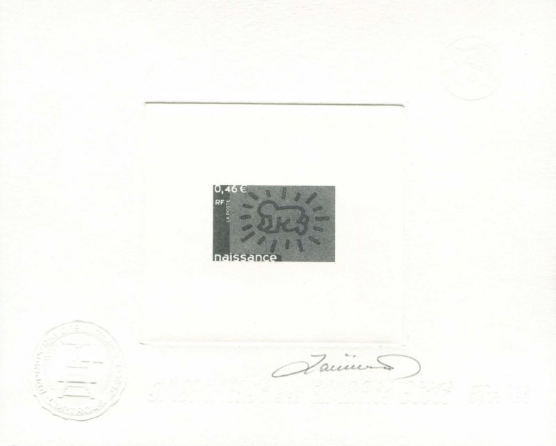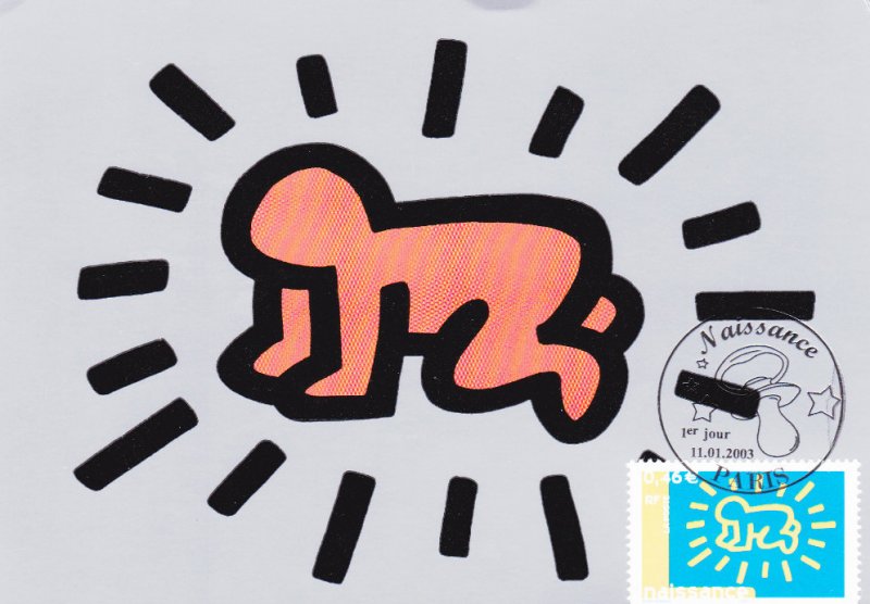 | Commentaire | Description synthétique du visuel du timbre : Keith Haring est né en Pennsylvanie en 1958 et est décédé en 1990 à New-York. Il étudia le graphisme publicitaire puis très tôt peint sur les murs du métro de New-York, sur les murs de Berlin et dans des hôpitaux aux États-Unis et en Europe (hôpital Necker à Paris). Reconnu avant tout comme un chantre de la culture urbaine, il se considérait comme un peintre de la société moderne, en particulier new-yorkaise. Un trait simple et des symboles facilement lisibles et colorés caractérisent une œuvre narrative, montrant des animaux, des enfants et reflétant pour certaines une certaine innocence. Timbre sans millésime |