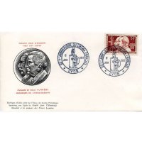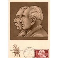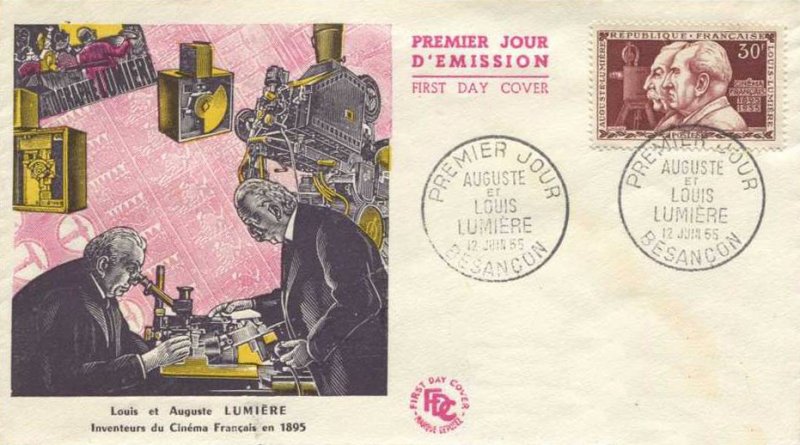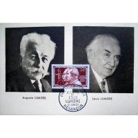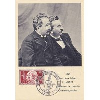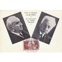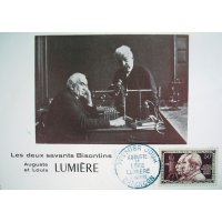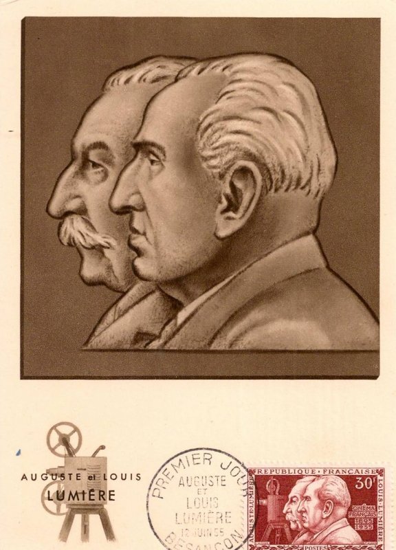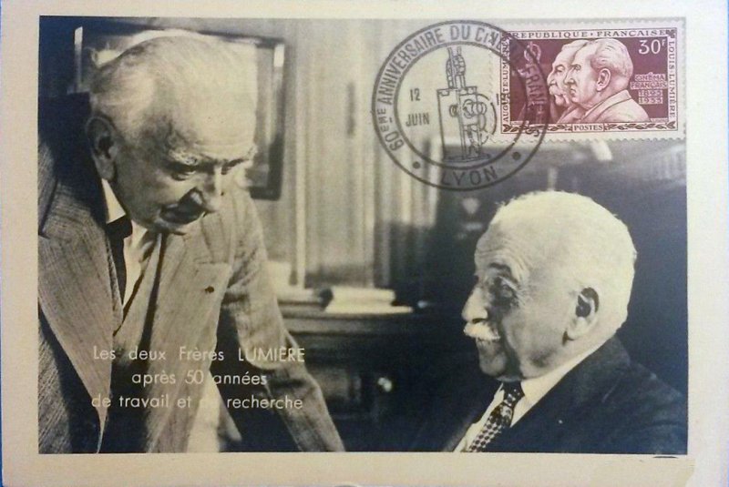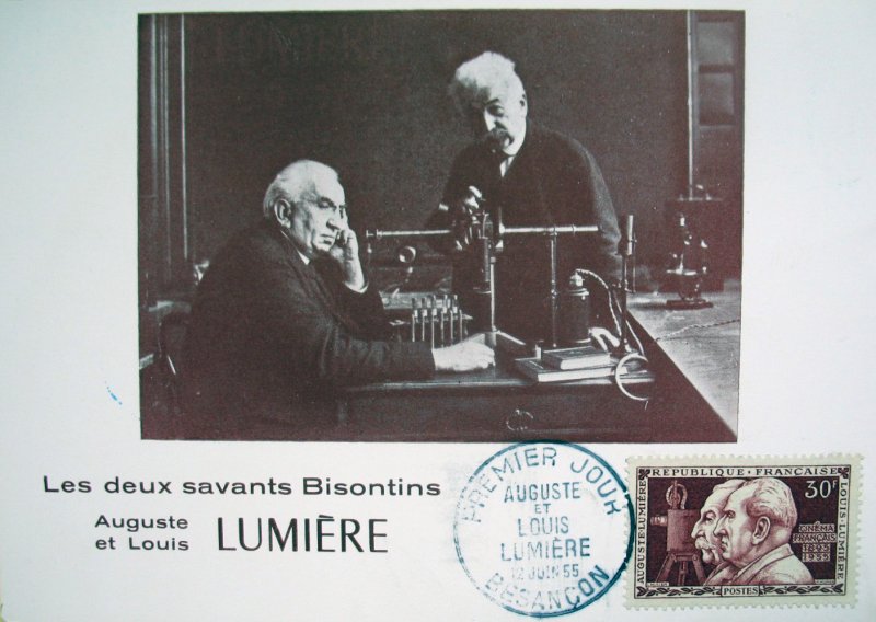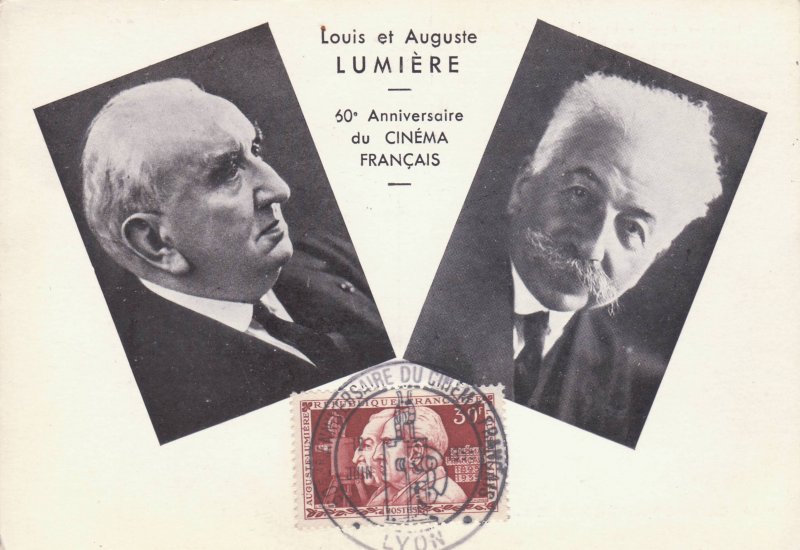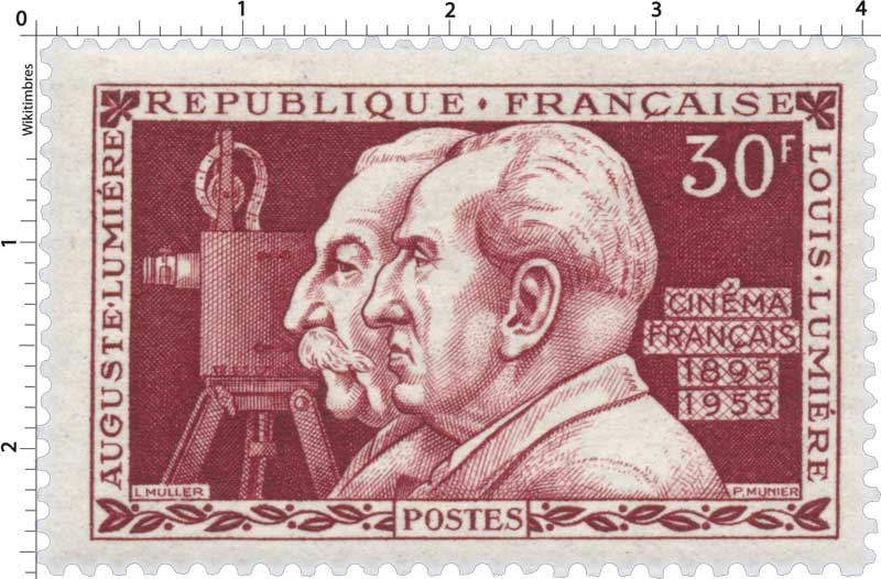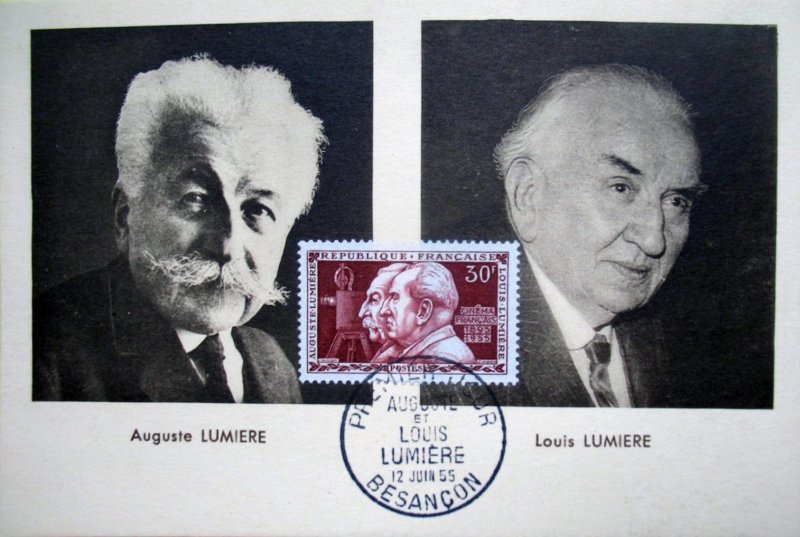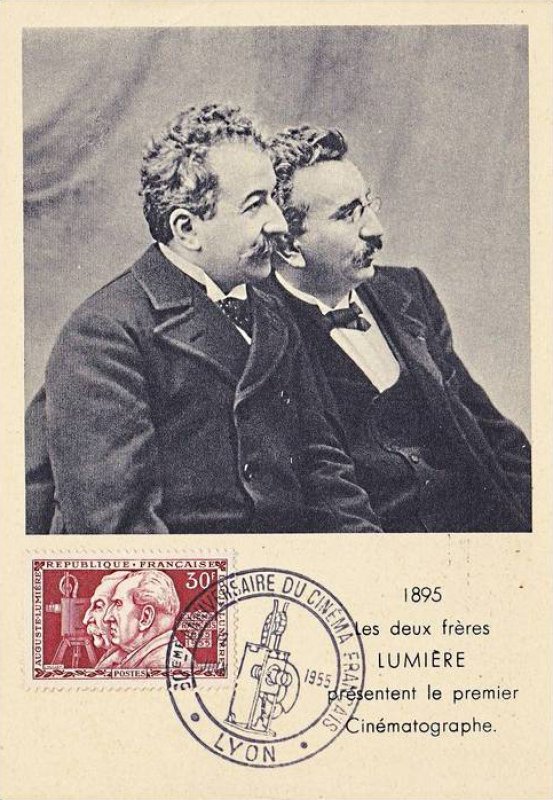| Commentaire | Visuel : les frères Auguste (19/10/1862 - 10/04/1954, ingénieur, biologiste et inventeur) et Louis (05/10/1864 - 06/06/1948, ingénieur, inventeur, industriel) LUMIÈRE ; qui, systématisant et approfondissant des travaux antérieurs, firent breveter le 13 février 1895, le premier appareil de projection cinématographique. Le premier cinématographe projecteur utilisant de la pellicule 35 mm à 2 perforations rondes / image |