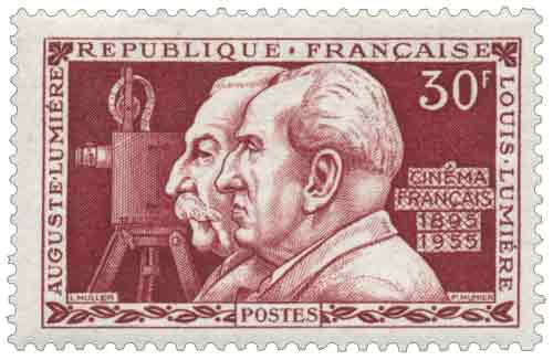 | Commentaire | Visuel : les frères Auguste (19/10/1862 - 10/04/1954, ingénieur, biologiste et inventeur) et Louis (05/10/1864 - 06/06/1948, ingénieur, inventeur, industriel) LUMIÈRE ; qui, systématisant et approfondissant des travaux antérieurs, firent breveter le 13 février 1895, le premier appareil de projection cinématographique. Le premier cinématographe projecteur utilisant de la pellicule 35 mm à 2 perforations rondes / image Émis en 1955 à l’occasion du soixantième anniversaire de l’invention du cinématographe, le timbre-poste français consacré à Auguste Lumière et Louis Lumière rend hommage aux deux ingénieurs dont la mise au point du procédé de projection cinématographique en 1895 a profondément transformé les formes d’expression visuelle et donné naissance au cinéma moderne, la figurine gravée en taille-douce et imprimée au format horizontal s’inscrivant dans une série d’émissions valorisant les grandes innovations scientifiques et techniques françaises, tandis que le contexte historique rappelé par cette émission souligne le passage du cinématographe, initialement conçu comme outil d’enregistrement documentaire, à un art à part entière intégré au patrimoine culturel du XXᵉ siècle, l’usage postal correspondant à des affranchissements de moyenne importance cohérents avec la valeur faciale élevée et confirmant la place de ce timbre dans la philatélie commémorative de l’après-guerre. |
