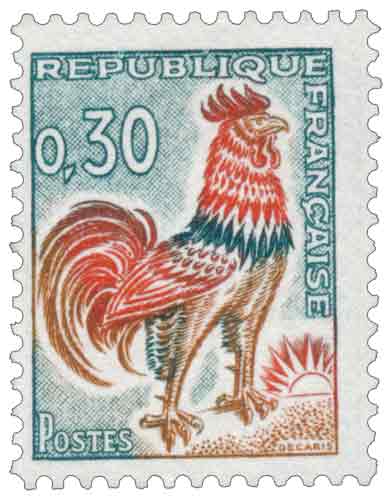 | Commentaire | voir la vidéo "Histoires de timbres" Émis en janvier 1965, le timbre « Coq de Decaris » à 0,30 franc prolonge la série d’usage courant consacrée au coq gaulois, symbole républicain profondément ancré dans l’iconographie postale française depuis le XIXᵉ siècle, et répond à l’évolution des tarifs postaux du milieu des années 1960. Toujours gravé en taille-douce par Albert Decaris, ce timbre conserve une composition volontairement stable et immédiatement identifiable, gage de continuité pour un timbre destiné à un usage quotidien intensif. Son apparition accompagne la modernisation progressive des modes de diffusion, avec une production largement orientée vers la roulette, adaptée aux besoins croissants des guichets et des entreprises, illustrant l’industrialisation accrue du service postal. Par son graphisme épuré, sa fonction strictement utilitaire et son maintien en vente sur plusieurs années, ce timbre témoigne de la politique postale française visant à associer efficacité, lisibilité et permanence symbolique, tout en s’inscrivant dans la longue durée des séries courantes à très large diffusion. Article rédigé pour WikiTimbres |