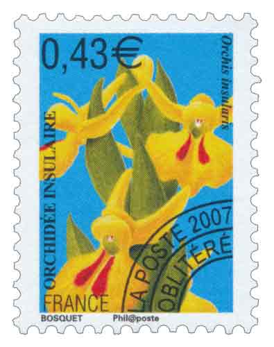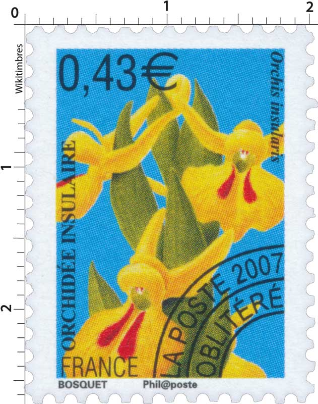 | Commentaire | Le visuel est identique à celui des préoblitérés émis en 2004 et 2005 : cette plante élancée, dont la hauteur varie de 20 à 50 cm, s’épanouit aussi bien en pleine lumière qu’à la mi-ombre. L’Orchis insularis fleurit d’avril à juin. Répartition : méditerranéenne occidentale principalement. |