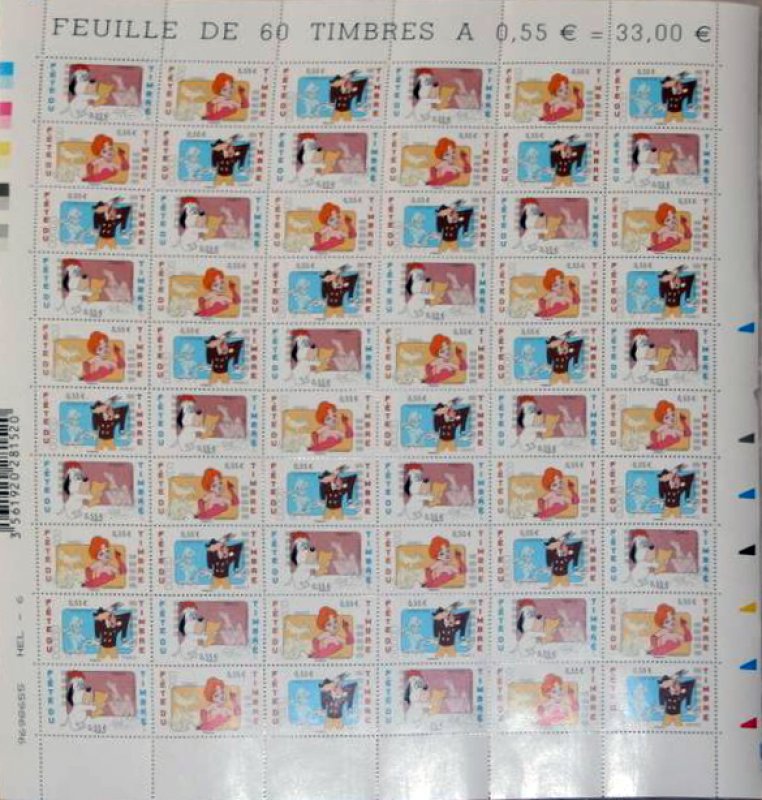 | Commentaire | Fête du timbre. Personnages des dessins animés de Tex Avery (1907-1980). La manifestation premier jour a lieu les 1er et 2 mars dans cent douze villes de France métropolitaine avec l'aide d'associations philatéliques locales. Le cachet premier jour, portant le nom d'une des villes, représente Droopy de face. |
