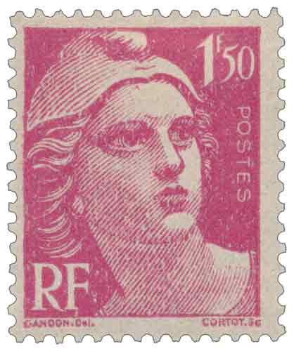 | Commentaire | Le timbre gommé de 1945 « Marianne de Gandon » à 1,50 franc rose s’inscrit dans la série définitive adoptée par la France à la Libération afin de réaffirmer les symboles républicains après la période de l’Occupation. Mis en vente le 15 février 1945, il correspond au tarif de la lettre simple jusqu’à 20 grammes pour l’intérieur et peut également servir de complément pour certains services postaux, notamment l’avis de réception des lettres recommandées ou la taxe de présentation des valeurs à recouvrer. Le choix de la Marianne, figure allégorique de la République, répond à une volonté politique et symbolique forte de retour aux valeurs républicaines et à la continuité de l’État. Le dessin, réalisé par Pierre Gandon, propose une représentation classique et apaisée de Marianne, rapidement adoptée comme image officielle sur de nombreuses valeurs faciales de l’après-guerre. La gravure est confiée à Henri Cortot et l’impression en typographie rotative marque le retour à des procédés industriels stabilisés après les contraintes matérielles du conflit, faisant de ce timbre une émission courante emblématique de l’année 1945 en France. |