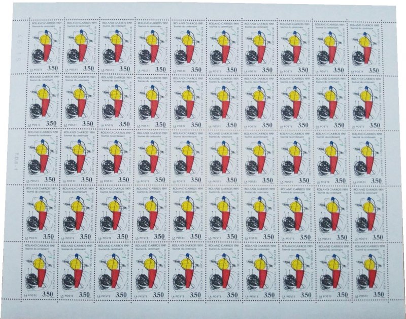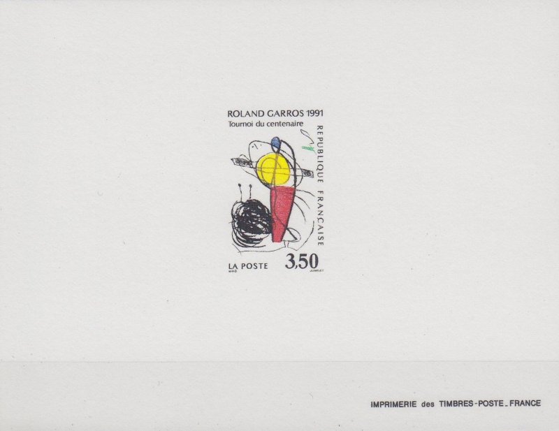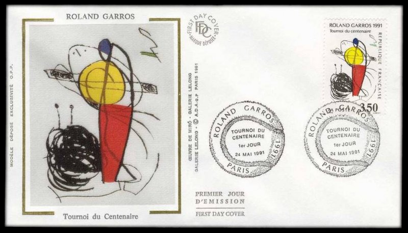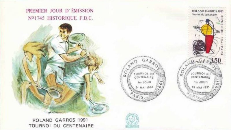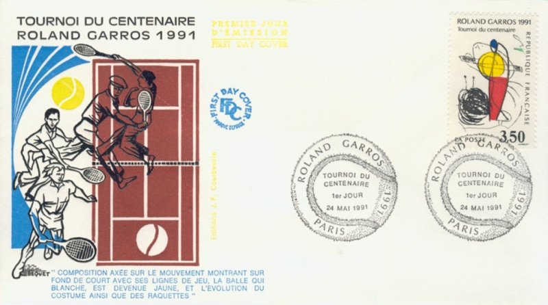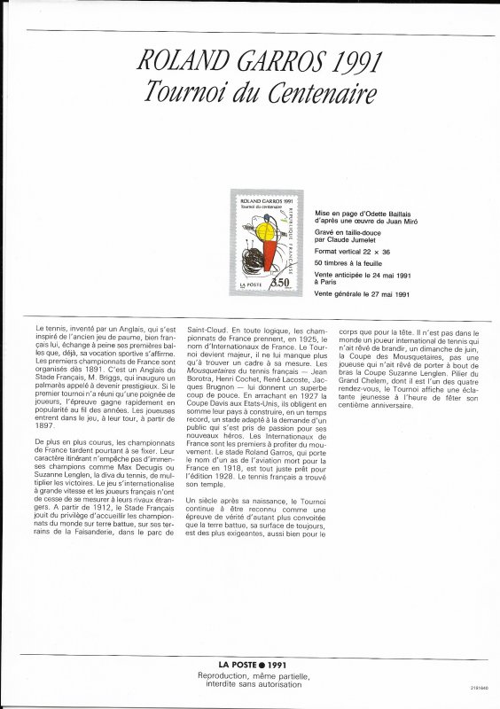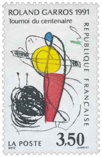 | Commentaire | Créé en 1991 pour célébrer le centenaire du tournoi de tennis de Roland-Garros, ce timbre reprend le visuel de l’affiche du tournoi créé par l’artiste Juan Miro. Chaque année, les organisateurs perpétuent la tradition consistant à apporter une touche d’art contemporain dans leur communication et laisser le soin à un artiste d’exprimer sa vision du tennis et du tournoi de la Porte d’Auteuil. En 1991, la 100ème édition du tournoi enregistrait chez les hommes la première victoire en grand chelem de Jim Courier aux dépens d’André Agassi et celle de Monica Seles qui, à 17 ans et demi, remportait déjà son 2ème titre à Roland-Garros. |