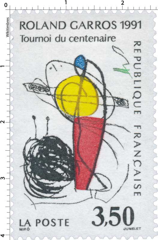 Créé en 1991 pour célébrer le centenaire du tournoi de tennis de Roland-Garros, ce timbre reprend le visuel de l’affiche du tournoi créé par l’artiste Juan Miro. Chaque année, les organisateurs perpétuent la tradition consistant à apporter une touche d’art contemporain dans leur communication et laisser le soin à un artiste