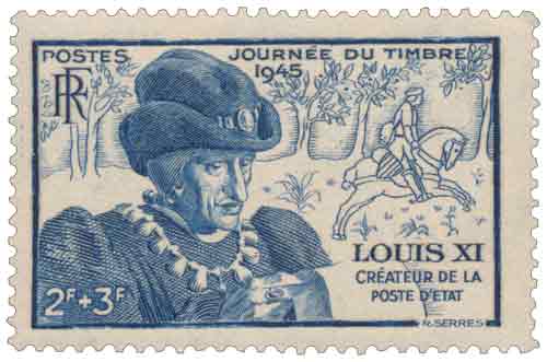 | Commentaire | Journée du timbre 1945 - Louis XI (1423-1483) - Créateur de la Poste d'État. Voir la vidéo "Histoires de timbres" Visuel : Louis XI, né le 3 juillet 1423 à Bourges, mort le 30 août 1483, fut un grand roi de France qui n'eut de cesse de renforcer et structurer son Royaume. Á cette fin, il créa la Poste d'Etat, premier service postal, à usage royal exclusif. Création d'un service de chevaucheurs (1479, premier "Contrôleur des Chevaucheurs) et de relais, à usage royal, ce qui lui permit de se tenir parfaitement au courant de l'état de ses provinces et de ses vassaux. Cette étape postale, donnera naissance à la poste aux lettres et à la poste aux chevaux. il est inhumé dans la Basilique de Cléry St André dans le Loiret Variantes du TP : des TP identiques, mais en typographie, et de couleurs différentes, sont émis à la même date : pour l'Algérie (brun lilas, avec surcharge bleu "Algérie") - la Tunisie (vert foncé, avec surcharge noire "Tunisie") et l'Afrique Occidentale Française (rouge, avec surcharge noire "A O F") - Le bon à tirer est signé le 17 août 1945. |
