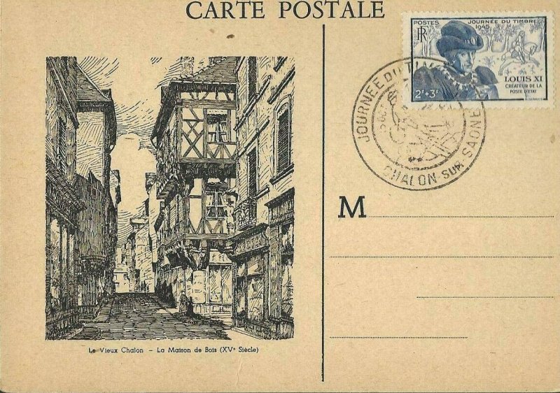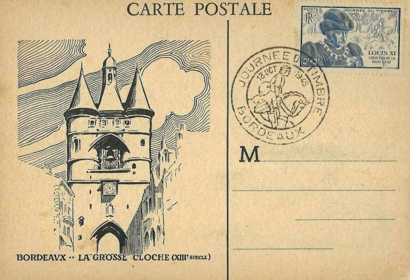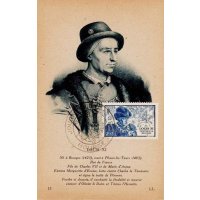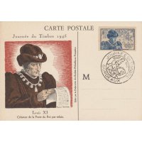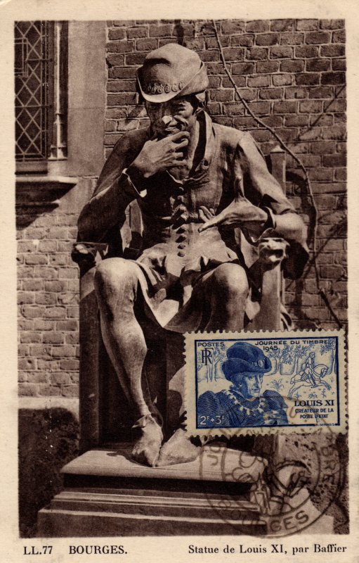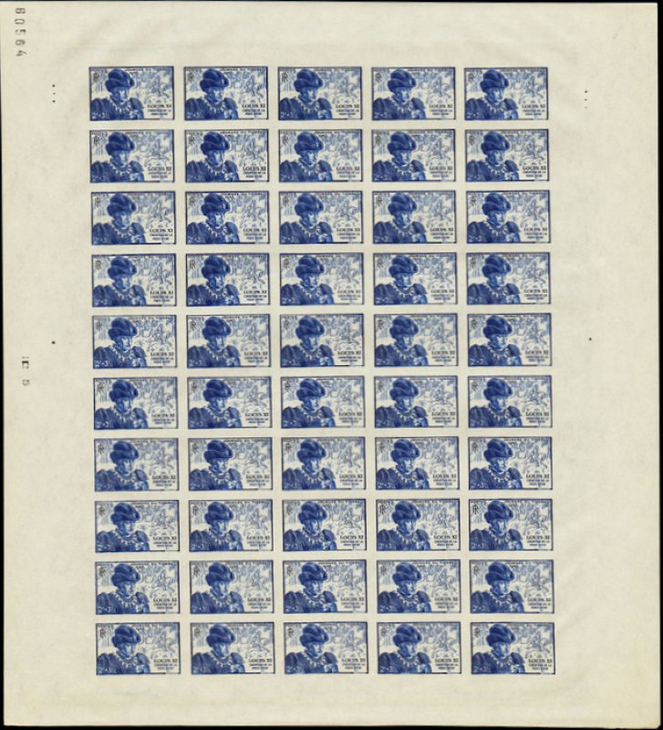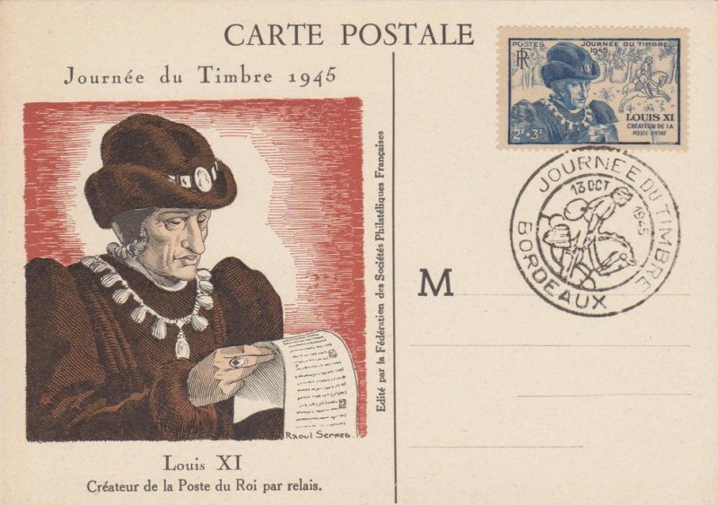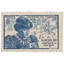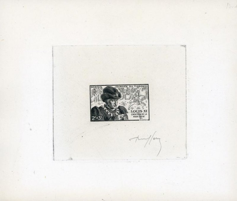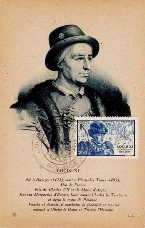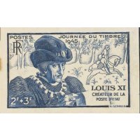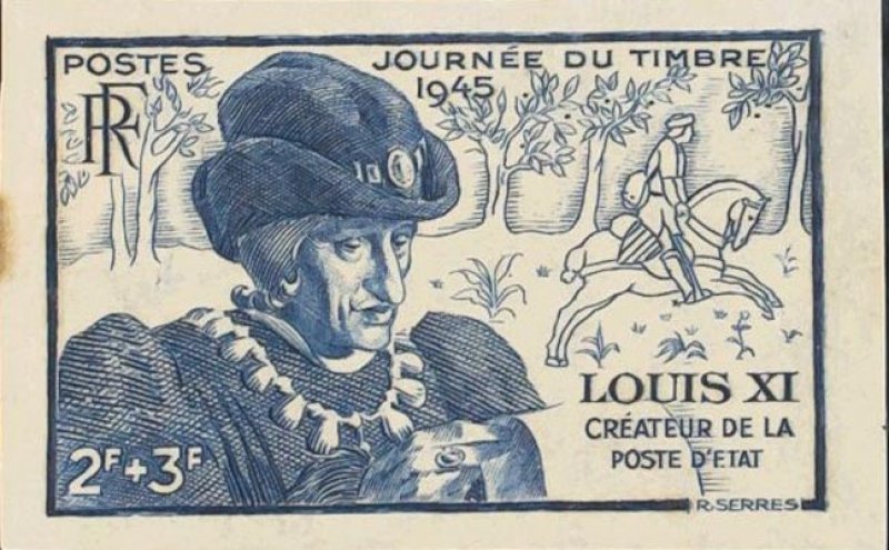 | Commentaire | Journée du timbre 1945 - Louis XI (1423-1483) - Créateur de la Poste d'État. Voir la vidéo "Histoires de timbres" Visuel : Louis XI, né le 3 juillet 1423 à Bourges, mort le 30 août 1483, fut un grand roi de France qui n'eut de cesse de renforcer et structurer son Royaume. Á cette fin, il créa la Poste d'Etat, premier service postal, à usage royal exclusif. Création d'un service de chevaucheurs (1479, premier "Contrôleur des Chevaucheurs) et de relais, à usage royal, ce qui lui permit de se tenir parfaitement au courant de l'état de ses provinces et de ses vassaux. Cette étape postale, donnera naissance à la poste aux lettres et à la poste aux chevaux. il est inhumé dans la Basilique de Cléry St André dans le Loiret Variantes du TP : des TP identiques, mais en typographie, et de couleurs différentes, sont émis à la même date : pour l'Algérie (brun lilas, avec surcharge bleu "Algérie") - la Tunisie (vert foncé, avec surcharge noire "Tunisie") et l'Afrique Occidentale Française (rouge, avec surcharge noire "A O F") - Le bon à tirer est signé le 17 août 1945. |