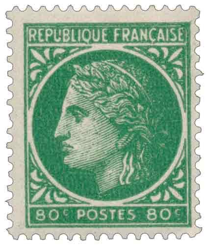 | Commentaire | Émis en France en 1945, le timbre gommé Cérès de Mazelin à 80 centimes vert-jaune appartient à la première série courante conçue pour accompagner la normalisation progressive des services postaux après la Libération, sa valeur étant affectée successivement à l’affranchissement des imprimés pour l’étranger, puis pour le régime intérieur avant d’être utilisée pour les journaux à partir d’octobre 1945 ; il s’inscrit dans la continuité des émissions françaises à effigie républicaine en reprenant la figure de Cérès, symbole historique d’abondance et de renouveau, déjà profondément ancrée dans la tradition philatélique nationale, tandis que son impression en typographie rotative, son format réduit et sa diffusion à grande échelle témoignent de son rôle central au sein de la série courante française de 1945. |