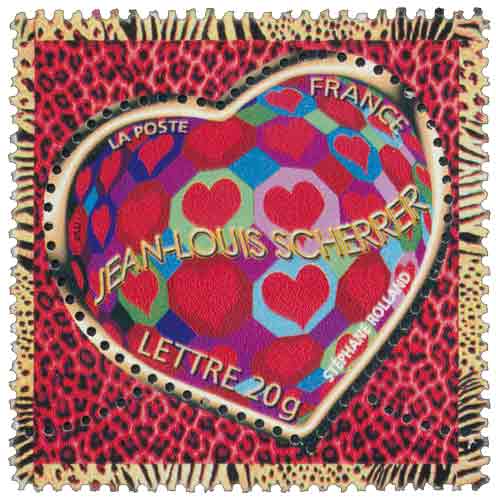 | Commentaire | Cette année 2006, Jean-Louis Scherrer rejoint le cercle des couturiers « timbrifiés » après Yves Saint-Laurent, Christian Lacroix, Torrente, Chanel et Cacharel. Dessinés par Stéphane Rolland, à qui la maison Jean-Louis Scherrer a confié la création de ses lignes haute-couture depuis 1997, les 2 timbres - un timbre à prisme et un timbre zébré - complètent la collection des « cœurs griffés ». Timbre sans millésime |