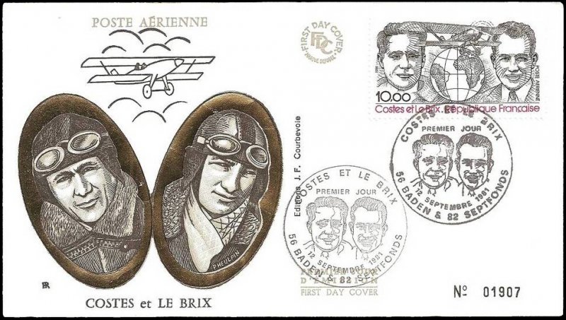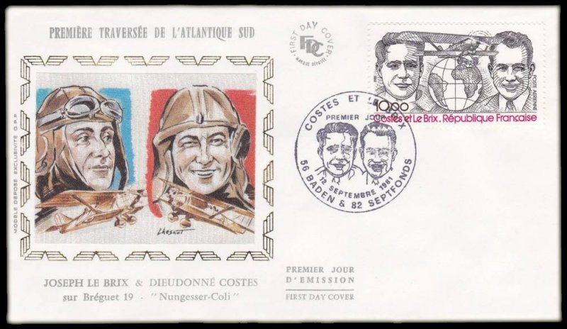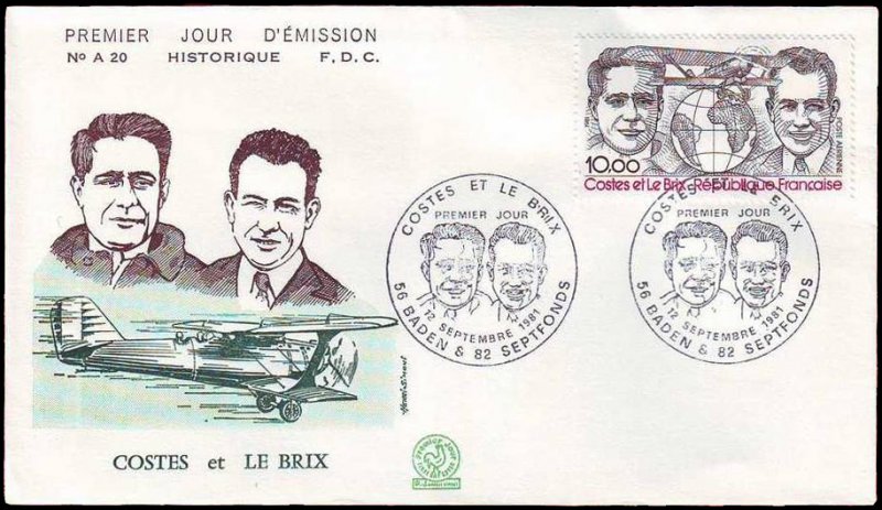 | Description | Hommages aux aviateurs Dieudonné Costes (1892-1973), né à Septfonds (Tarn-et-Garonne), et Joseph Le Brix (1899-1931), né à Baden (Morbihan). Première traversée de l'Atlantique Sud sans escale, 1927 |