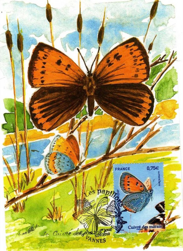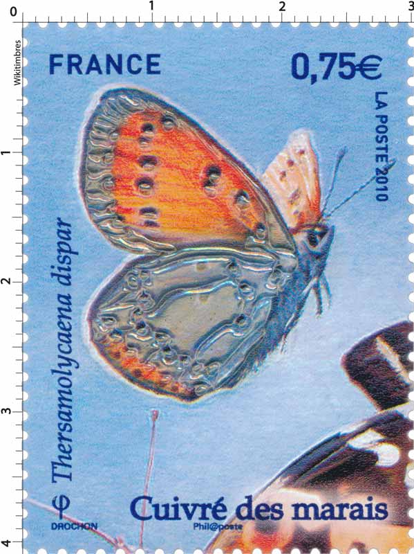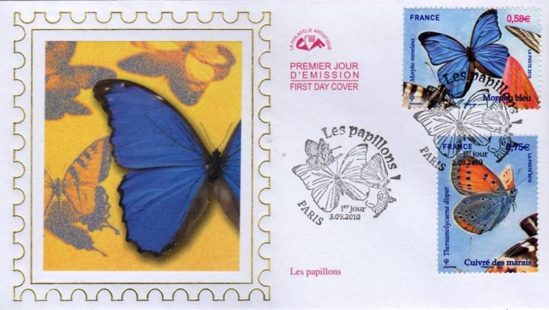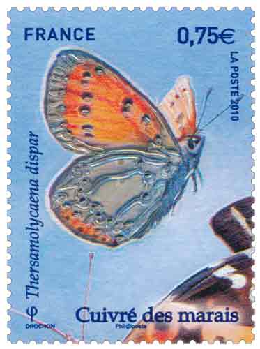 | Commentaire | Le papillon, considéré comme un symbole de grâce et de légèreté, représente également la résurrection, le soleil chez les Aztèques, la femme au Japon et l’âme mariée à l’amour dans la mythologie grecque. Le cuivré des marais, le morpho bleu et le thécla de la ronce illustrent chacun un des timbres du bloc Nature 2010, le 4e timbre étant dédié à la chenille du grande queue fourchue. Ces insectes lépidoptères sous leur forme adulte sont caractérisés par deux paires d’ailes recouvertes d’écailles fines. La couleur bleue ou verte des écailles des 3 papillons sera mise en lumière par la pose d’un film iridescent complétée d’un gaufrage.