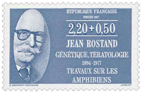 | Commentaire | Les timbres imprimés en feuille ont une gomme mate. Ceux imprimés en carnets ont une gomme brillante. Né à Paris en 1894, Jean Rostand a très tôt orienté sa vie vers la biologie, une vocation forgée dans l’enfance à Cambo, au contact d’un environnement naturel propice à l’observation et renforcée par la lecture fondatrice des Souvenirs entomologiques de Jean-Henri Fabre. Fils de l’écrivain Edmond Rostand, il choisit cependant une voie scientifique indépendante, refusant les carrières académiques traditionnelles pour travailler en naturaliste autonome. Après des études de sciences naturelles, il installe dès 1920 un laboratoire personnel à Ville-d’Avray, où il mène des recherches originales sur la reproduction, la génétique et la tératologie des amphibiens. Ce timbre rend hommage à un savant dont les travaux ont marqué la biologie du XXe siècle, notamment par l’étude de la gynogenèse, des anomalies du développement et des mécanismes de l’hérédité. Les recherches de Jean Rostand ont débouché sur des applications concrètes, telles que la conservation des cellules et tissus grâce à l’action antigel de certaines substances, ouvrant des perspectives durables pour la biologie et la médecine. Parallèlement à son activité expérimentale, il a joué un rôle majeur dans la diffusion du savoir scientifique, publiant de nombreux ouvrages de vulgarisation qui ont contribué à rapprocher la science du grand public. Élu à l’Académie française, il incarne une figure singulière de savant humaniste, attentif aux implications morales du progrès scientifique. Ce timbre s’inscrit ainsi dans la politique commémorative française visant à mettre en lumière des personnalités scientifiques dont l’œuvre a durablement enrichi la connaissance et la culture, en rappelant la place essentielle de la biologie dans les réalisations intellectuelles françaises du XXe siècle. Article rédigé pour WikiTimbres |