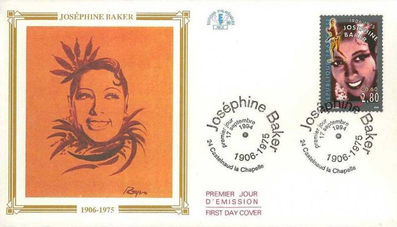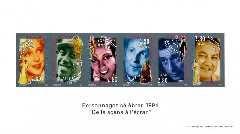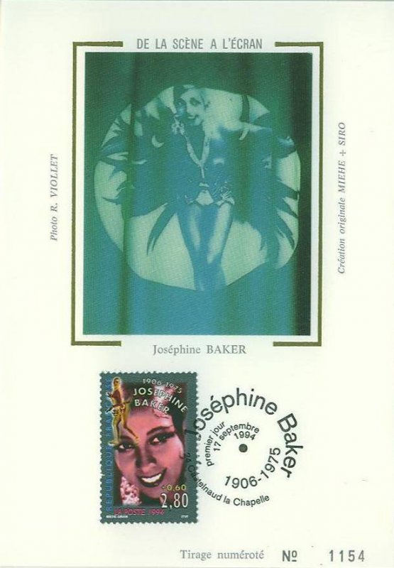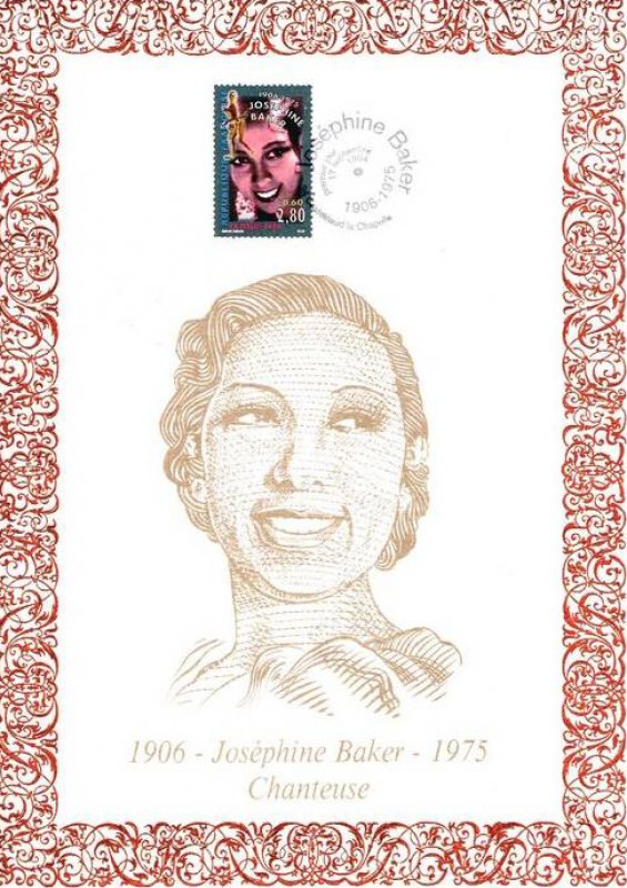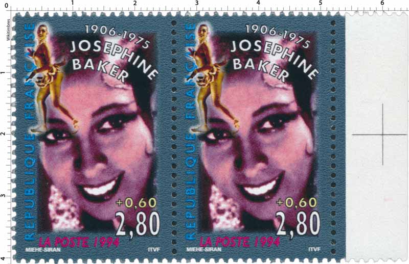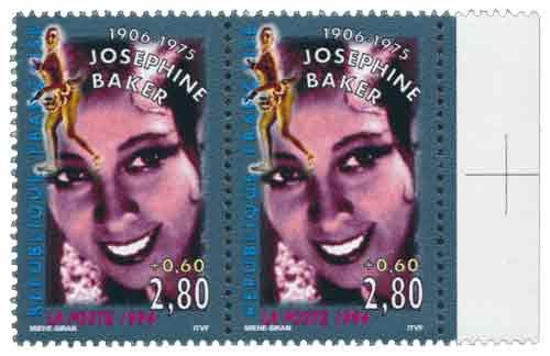 | Commentaire | Paire issue d'une feuille de 50 TP Visuel : Chanteuse, danseuse et meneuse de revue, actrice et résistante, née à Saint-Louis (Missouri, Etats-Unis), a acquit la nationalité française en 1937. Elle entre dans les services secrets de la France libre en nov. 1940, puis reprend sa carrière après la guerre. Elle achète et s'installe au "Domaine des Milandes" (Dordogne) et accueille douze enfants adoptés, de toutes origines. Elle paraîtra dans cinq films, mais sa carrière cinématographique sera courte ; elle ne retrouve pas à l'écran les succès qu'elle connaît sur scène. |