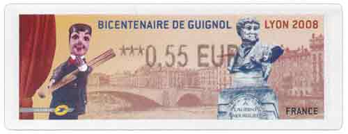 | Commentaire | Visuel : Guignol et sa tavelle + le buste de Laurent MOURGUET et son personnage de GUIGNOL à Lyon. Un monument de l'architecte Albert-Charles Meysson (1869-1947), sculpté par François Girardet (le buste) et Pierre Aubert (le socle). Il est inauguré le 21 avril 1912 (av. du Doyenné) arrière plan : le pont Bonaparte (1950), enjambant la Saône, avant son confluent avec le Rhône, et menant au Vieux Lyon. |