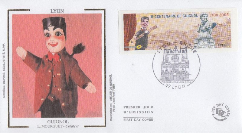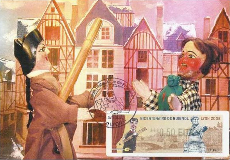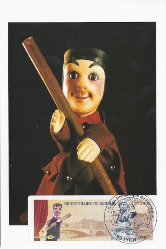 | Commentaire | Visuel : Guignol et sa tavelle + le buste de Laurent MOURGUET et son personnage de GUIGNOL à Lyon. Un monument de l'architecte Albert-Charles Meysson (1869-1947), sculpté par François Girardet (le buste) et Pierre Aubert (le socle). Il est inauguré le 21 avril 1912 (av. du Doyenné) arrière plan : le pont Bonaparte (1950), enjambant la Saône, avant son confluent avec le Rhône, et menant au Vieux Lyon. |