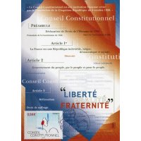 | Commentaire | Existe également en autoadhésif. La mise en vente anticipée a lieu le 5 mars au Conseil constitutionnel, à Paris. Y est disponible un cachet premier jour représentant Marianne tenant les tables de la loi, dans une vue plus classique dessinée par Ghinéa. Le conseil constitutionnel veille |