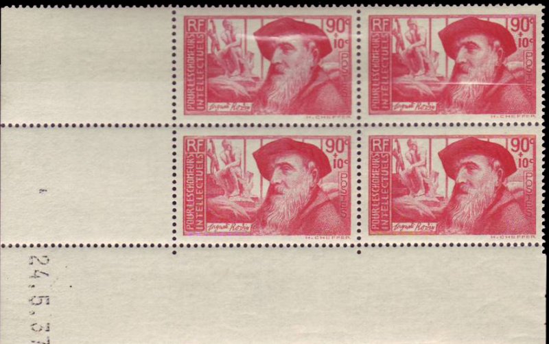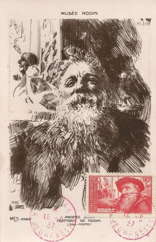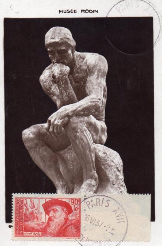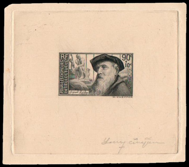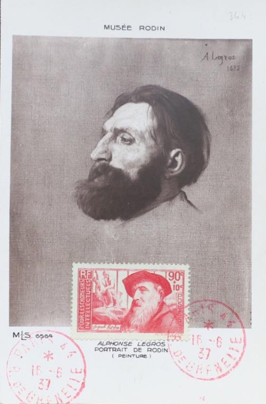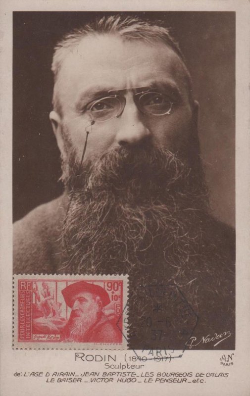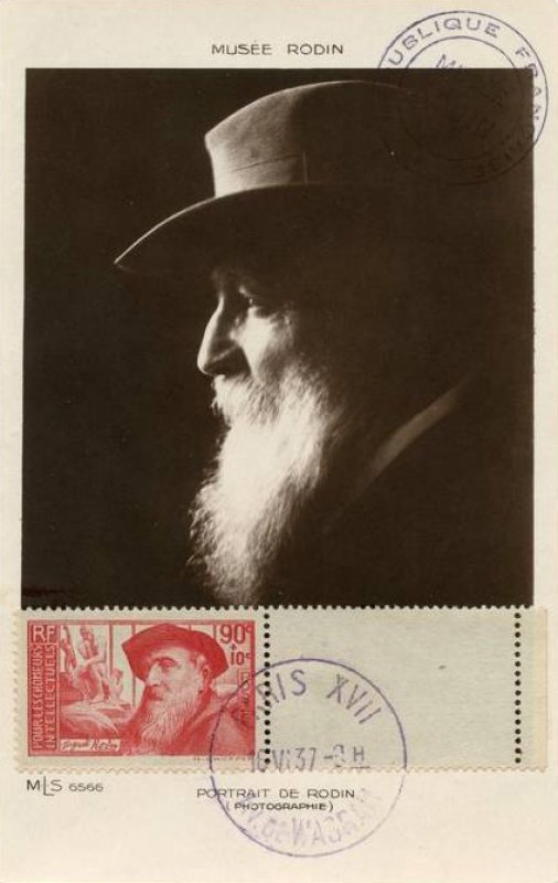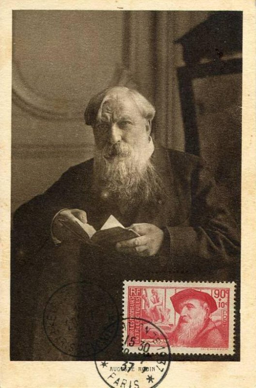 | Commentaire | Visuel : le portrait d'Auguste Rodin, coiffé d'un béret noir, et au second plan, deux de ses œuvres sculptées : "L'Enfant prodigue" – 1905 - bronze - H. 138 cm ; L. 87 cm ; P. 75 cm (réalisée par la fonderie Alexis Rudier en 1942, pour les collections du musée Rodin). Ce corps masculin, tendu comme un arc, trouve son origine dans le groupe d'Ugolin et ses enfants, créé pour "La Porte de l'Enfer" - élan irrépressible d’une ultime prière. et "Le Penseur" - 1903 – Bronze - H. 180 cm ; L. 98 cm ; P. 145 cm (réalisée par la fonderie Alexis Rudier en 1904 et attribuée au musée Rodin en 1922). Créé dès 1880 (taille d’origine, 70 cm), pour orner le tympan de "La Porte de l’Enfer", il s'intitulé "Le Poète" et représentait Dante, l’auteur de "La Divine Comédie" qui avait inspiré "La Porte", penché en avant pour observer les cercles de l’Enfer en méditant sur son œuvre. à gauche du portrait : la signature de l'artiste sculpteur En savoir plus sur Wikipédia : Auguste Rodin |